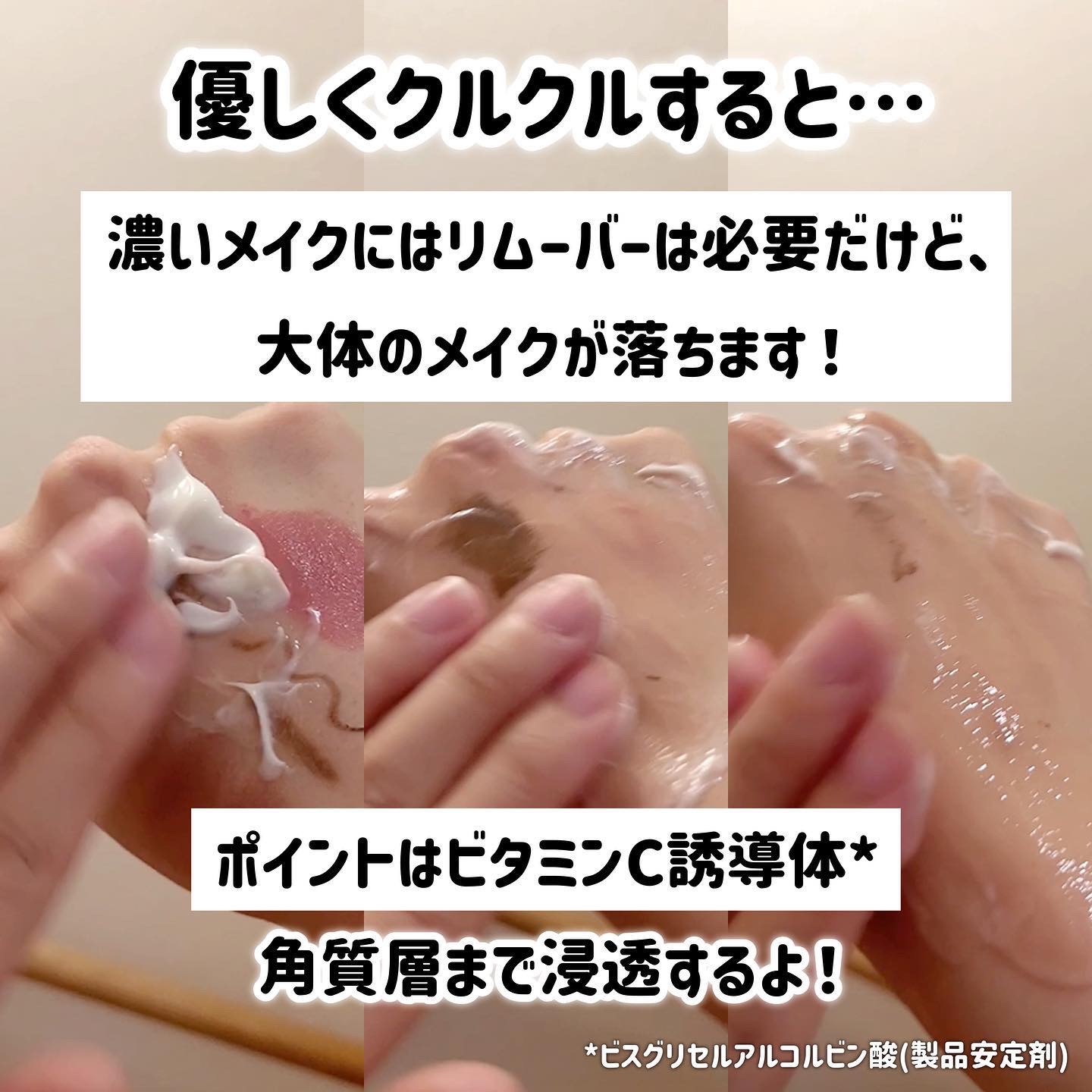 - ビタミンケアで始める、ベイビースキン計画!誕生、クリームバームクレンジング。 落とす「バーム」と守る「クリーム」を掛け合わせた、新感覚クレンジングです。クレンジング中もビタミンC誘導体*が角質層のすみずみまで届き、しっかり浸透。肌の水分と油分のバランスを整え、肌をひきしめツルッと輝く透明感ある肌へ。*整肌成分
