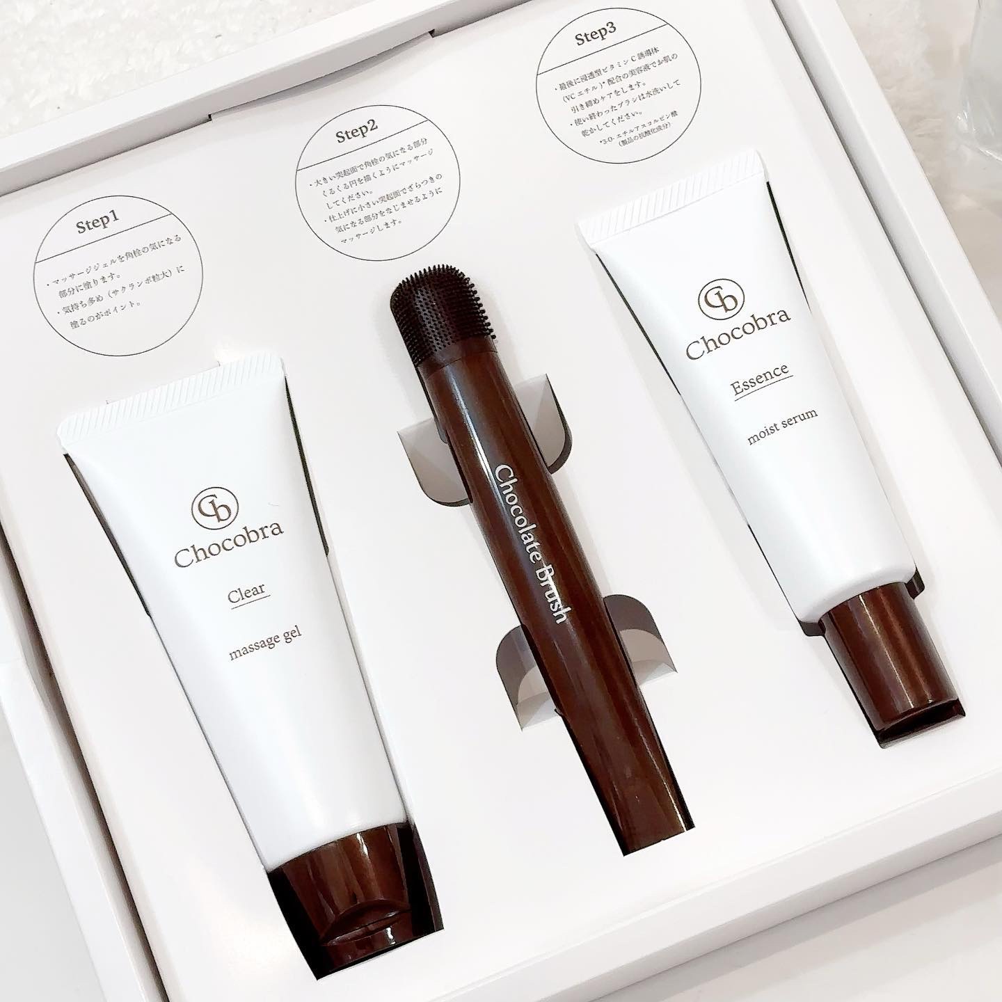 こちらは気になる毛穴を集中的にケアすることができる ' 毛穴ケアセット'です︎🤍 マッサージジェルは粘土が高いテクスチャーで、気になる部分にぴたっと密着してくれます ✔ ブラシは大きい突起面と小さい突起面に裏表で分かれているため気になる部分によって使い分けできるのも嬉しいポイントです😌💭 ブラシでくるくるとマッサージしているとじんわりと温かくなり気持ちのいい使用感です🧡 美容液はしっとりめのテクスチャーですが使用感はサラッとしていてベタつきません👏🏻ほんのり柑橘系の香りで使用感がとても良いです💛 気になる毛穴が3STEPで簡単にケアできる 'チョコブラ スペシャル 毛穴ケアセット'✨