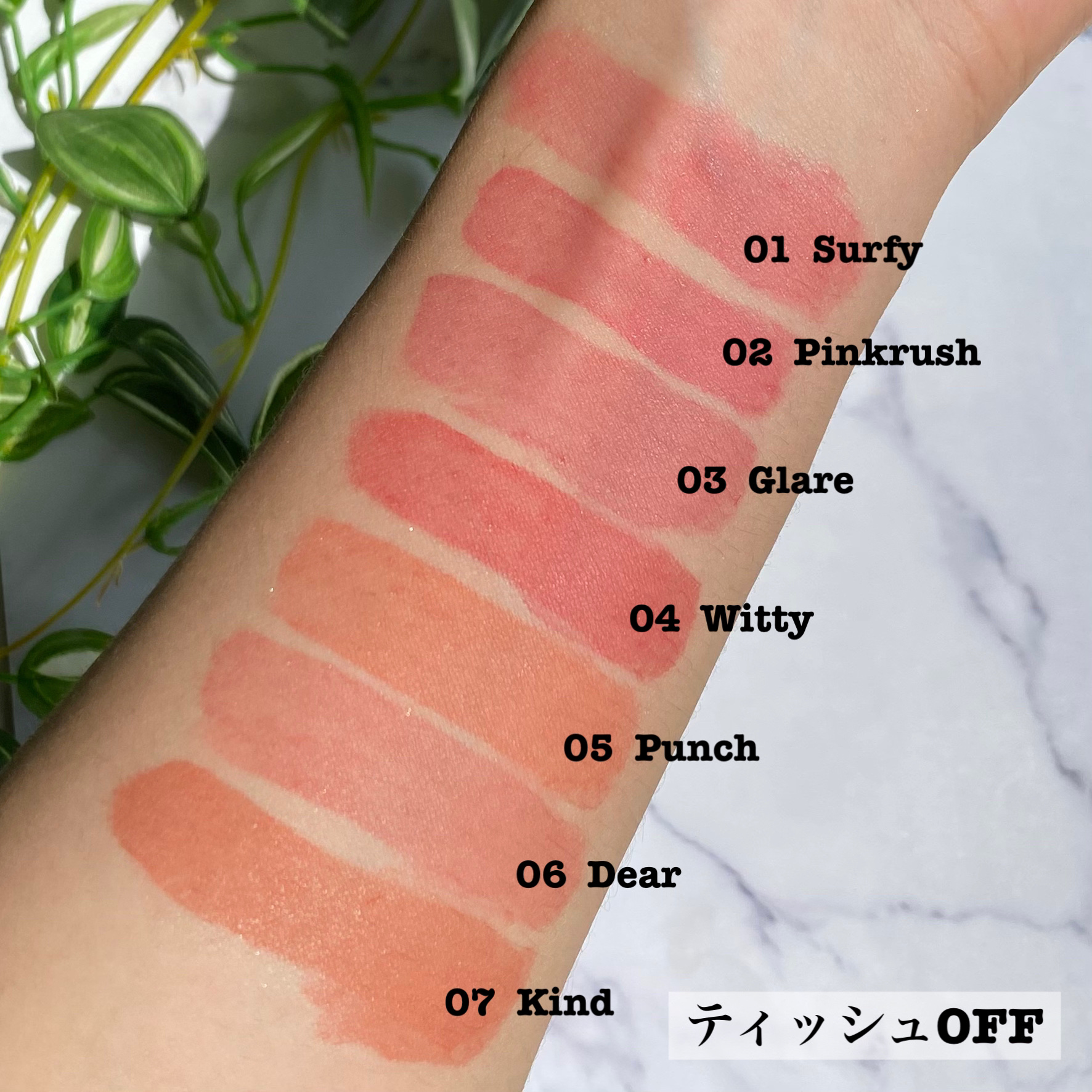 - <01 ソフィー(Surfy)> リンゴ酸ジイソステアリル、ジフェニルシロキシフェニルトリメチコン、精製水、ジフェニルジメチコン、ビスジグリセリルポリアシルアジペート-2、水添ポリイソブテン、ポリグリセリン-3、ポリソルベート60、セチルPEG/PPG-10/1ダイメチコン、イソステアリン酸ソルビタン、BG、ペンチレングリコール、1,2-ヘキサンジオール、ダイメジメチコン、アクリル酸ヒドロキシエチル/ナトリウムアクリロイルジメチルタウリン酸共重合体スクアラン、セテアレス-20、二酸化チタン、エチルヘキシルグリセリン、赤色227号、黄色5 号、香料、赤色104号(1)、水酸化酸化アルミニウム、ポリアクリル酸アンモニウム溶液、黄色4号、フェノキシエタノール、マカデミア種子油、ローズヒップ油、ツバキ油、トコフェロール <02 ピンクラッシュ(Pinkrush)> リンゴ酸ジイソステアリル、ジフェニルシロキシフェニルトリメチコン、精製水、ビスジグリセリルポリアシルアジペート-2、ジフェニルジメチコン、水添ポリイソブテン、ポリグリセリン-3、ポリソルベート60、セチルPEG/PPG-10/1ダイメチコン、イソステアリン酸ソルビタン、BG、ダイメジメチコン、ペンチレングリコール、1,2-ヘキサンジオール、アクリル酸ヒドロキシエチル/ナトリウムアクリロイルジメチルタウリン酸共重合体スクアラン、セテアレス-20、二酸化チタン、エチルヘキシルグリセリン、赤色227号、黄色5 号、香料、水酸化酸化アルミニウム、ポリアクリル酸アンモニウム溶液、フェノキシエタノール、マカデミア種子油、ローズヒップ油、ツバキ油、トコフェロール <03 グレア(Glare) > リンゴ酸ジイソステアリル、ジフェニルシロキシフェニルトリメチコン、精製水、ビスジグリセリルポリアシルアジペート-2、ジフェニルジメチコン、水添ポリイソブテン、ポリグリセリン-3、ポリソルベート60、セチルPEG/PPG-10/1ダイメチコン、イソステアリン酸ソルビタン、BG、ペンチレングリコール、1,2-ヘキサンジオール、ダイメジメチコン、アクリル酸ヒドロキシエチル/ナトリウムアクリロイルジメチルタウリン酸共重合体スクアラン、セテアレス-20、二酸化チタン、エチルヘキシルグリセリン、黄色5 号、香料、赤色104号(1)、赤色227号、水酸化酸化アルミニウム、ポリアクリル酸アンモニウム溶液、黄色4号、フェノキシエタノール、ブリリアントブルーFCF、マカデミア種子油、ローズヒップ油、ツバキ油、トコフェロール <04 ウィッティー(Witty)> リンゴ酸ジイソステアリル、ジフェニルシロキシフェニルトリメチコン、精製水、ビスジグリセリルポリアシルアジペート-2、ジフェニルジメチコン、水添ポリイソブテン、ポリグリセリン-3、ポリソルベート60、セチルPEG/PPG-10/1ダイメチコン、イソステアリン酸ソルビタン、BG、ダイメジメチコン、ペンチレングリコール、1,2-ヘキサンジオール、アクリル酸ヒドロキシエチル/ナトリウムアクリロイルジメチルタウリン酸共重合体スクアラン、セテアレス-20、二酸化チタン、黄色5 号、赤色227号、エチルヘキシルグリセリン、香料、水酸化酸化アルミニウム、ポリアクリル酸アンモニウム溶液、フェノキシエタノール、マカデミア種子油、ローズヒップ油、ツバキ油、トコフェロール <05 パンチ(Punch)> リンゴ酸ジイソステアリル、ジフェニルシロキシフェニルトリメチコン、精製水、ジフェニルジメチコン、ビスジグリセリルポリアシルアジペート-2、水添ポリイソブテン、ポリグリセリン-3、ポリソルベート60、セチルPEG/PPG-10/1ダイメチコン、イソステアリン酸ソルビタン、BG、ペンチレングリコール、1,2-ヘキサンジオール、ダイメジメチコン、アクリル酸ヒドロキシエチル/ナトリウムアクリロイルジメチルタウリン酸共重合体二酸化チタン、スクアラン、セテアレス-20、黄色5 号、エチルヘキシルグリセリン、香料、赤色227号、赤色104号(1)、水酸化酸化アルミニウム、ポリアクリル酸アンモニウム溶液、フェノキシエタノール、マカデミア種子油、ローズヒップ油、ツバキ油、トコフェロール <06 ディア(Dear)> リンゴ酸ジイソステアリル、ジフェニルシロキシフェニルトリメチコン、精製水、ジフェニルジメチコン、ビスジグリセリルポリアシルアジペート-2、水添ポリイソブテン、ポリグリセリン-3、ポリソルベート60、セチルPEG/PPG-10/1ダイメチコン、イソステアリン酸ソルビタン、BG、ペンチレングリコール、1,2-ヘキサンジオール、ダイメジメチコン、アクリル酸ヒドロキシエチル/ナトリウムアクリロイルジメチルタウリン酸共重合体スクアラン、セテアレス-20、二酸化チタン、エチルヘキシルグリセリン、黄色5 号、赤色227号、香料、水酸化酸化アルミニウム、黄色4号、ポリアクリル酸アンモニウム溶液、フェノキシエタノール、マカデミア種子油、ブリリアントブルーFCF、ローズヒップ油、ツバキ油、トコフェロール <07 カインド(Kind)> リンゴ酸ジイソステアリル、ジフェニルシロキシフェニルトリメチコン、精製水、ジフェニルジメチコン