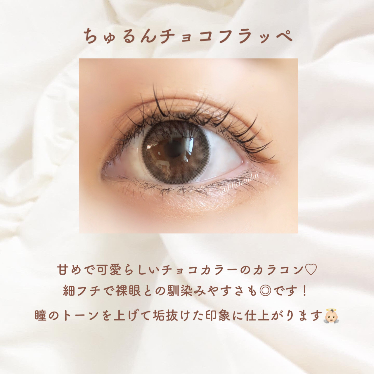 - ※2023年7月よりパッケージ底面カラー名表記部分、順次リニューアル。尚、これに係る商品の返品・交換等は承っておりません。 女の子の「かわいい」がぜーんぶ叶うよくばりなラインナップ 絶対ばぶフェイス♡ちゅるんチョコフラッペ DIA14.2mm/着色直径13.5mm 細フチ×ピュアベージュ ピュアちゅるんレンズで守りたくなっちゃうような甘めの瞳に 王道人類モテ♡ふわふわカプチーノ DIA14.5mm/着色直径13.7mm ぽんわりフチ×ふわブラウン フチふんわりシフォンブラウンレンズで優し気な瞳に 超絶盛れ地雷女子♡きゅるきゅるダークモカ DIA14.5mm/着色直径13.8mm 溶け込みグラデ×きゅるんブラック くっきり暗めカラーレンズでお人形さんみたいにくっきりとした印象の瞳に 韓国系クール美人♡ぷるるんソーダフロート DIA14.2mm/着色直径13.2mm うるうる質感×透明感ブルー うるうる透明感ブルーグレーレンズでクールビューティーな瞳に 商品名 :PUUUUCHU(プーチュ) 価格 :1,650円 税込(10枚入り) カラー :全4色 レンズ :BC8.6mm DIA14.2mm/14.5mm UVカット 含水率 :38% 使用期間 :終日装用、一日交換 度数 :0.00D(度なし),-0.50D~-6.00D(0.25D刻み),-6.50D~-10.00D(0.50D刻み) 販売名 :ワンデーツッティアルファ 承認番号 :22400BZX00427000 カラーコンタクトレンズの不適正使用による眼障害の危険性等などがあります。 ●コンタクトレンズは高度管理医療機器です。不十分な洗浄・消毒など不適切なケアや、長時間・交換期間を超えた装用により、アレルギー性結膜炎、角膜感染症、角膜潰瘍等の重篤な眼障害が発生する危険性があります ●ご使用前に取扱説明書を確認してください 使用上の留意事項 ●眼科医院等を受診してからお求めください ●眼に異常を感じたら直ちにレンズ使用を中止し、お近くの眼科等で診察を受けてください ●医師の指示にしたがってご使用ください ●コンタクトレンズを装用する場合、自覚症状がなくても、眼科医院等での定期検査を受けてください ●レンズに不具合がある場合は使用しないでください