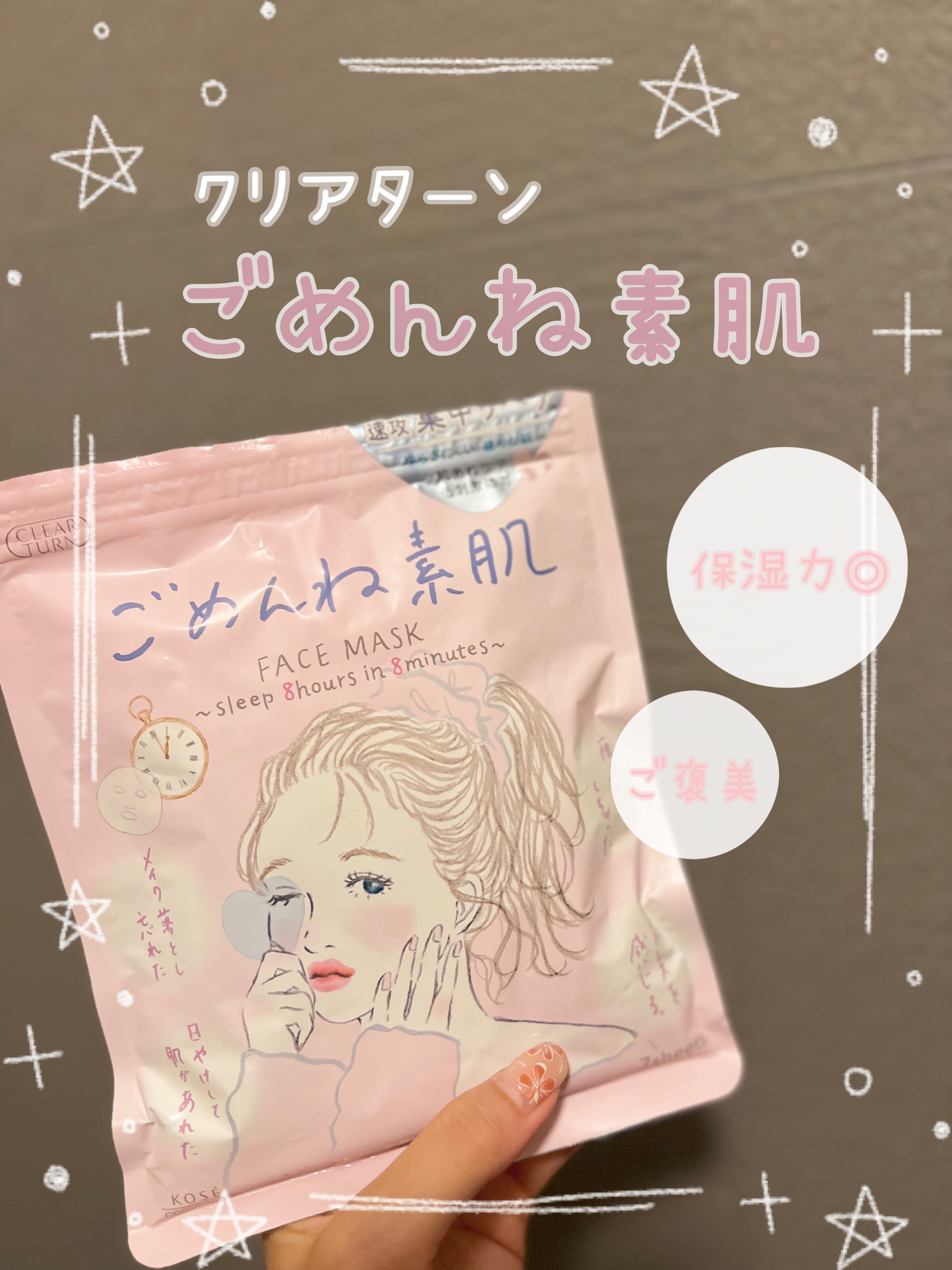 - 【クリアターン ごめんね素肌マスク】 負担をかけて、あれてしまった肌の素肌環境※1をととのえる“速攻集中リペア※2マスク”です。 ① あれがちな肌を素早くコンディションケア! ザクロエキス、桜エキス※3、ウメ果実エキスBG配合し、ゆらぎやすい肌環境をととのえ、肌あれをケアします。また、うるおいケア成分として、ヒアルロン酸、白キクラゲ多糖体BGを配合。外的ストレス※4や不規則な生活の影響を受けやすい肌も健やかでゆらぎにくい肌へみちびきます。 ②敏感肌も使える、弱酸性・低刺激処方 無香料・無着色・無鉱物油・アルコールフリー(エチルアルコール)・パラベンフリー・紫外線吸収剤フリー・シリコーンフリー・パッチテスト済み・アレルギーテスト済み・スティンギングテスト済み・敏感肌自覚者による連用テスト済み(すべての方にアレルギーや皮膚刺激が起きない、刺激感がないというわけではありません。すべての方の肌に合うということではありません。) ③角質ケアもできる!凸凹高密着シート コットン生まれのやわらかな肌触りのベンリーゼを使用。 表面に凸凹のエンボス加工を施しているため、密着性が高く、はがしたマスクでやさしく顔をふきとることで角質ケアもできます。 ※1 うるおい環境のこと ※2 うるおいお手入れのこと ※3 ソメイヨシノ葉エキス、ウメ果実エキスBGはウメ果実エキス・BG(保湿) ※4 乾燥による刺激のこと