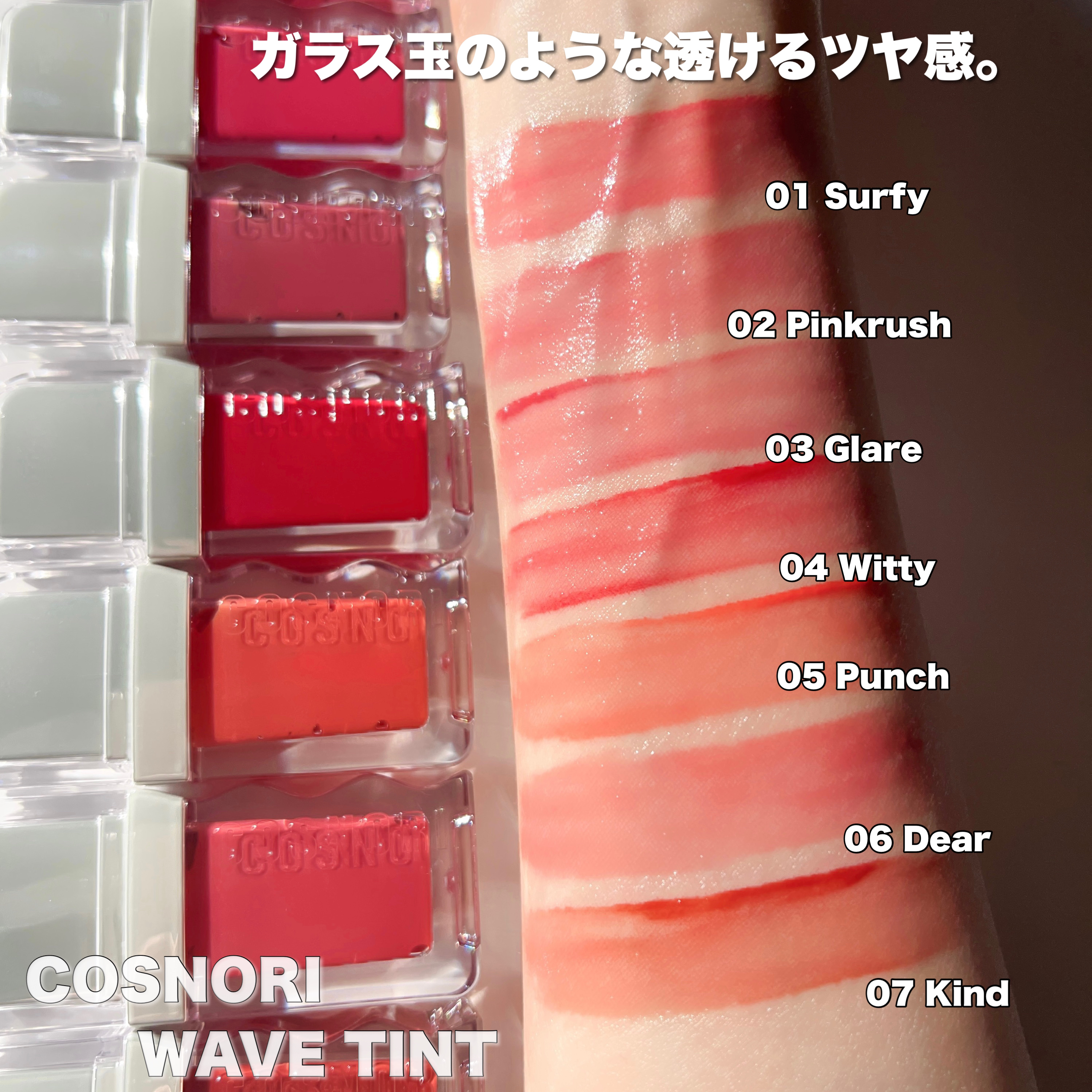- <01 ソフィー(Surfy)> リンゴ酸ジイソステアリル、ジフェニルシロキシフェニルトリメチコン、精製水、ジフェニルジメチコン、ビスジグリセリルポリアシルアジペート-2、水添ポリイソブテン、ポリグリセリン-3、ポリソルベート60、セチルPEG/PPG-10/1ダイメチコン、イソステアリン酸ソルビタン、BG、ペンチレングリコール、1,2-ヘキサンジオール、ダイメジメチコン、アクリル酸ヒドロキシエチル/ナトリウムアクリロイルジメチルタウリン酸共重合体スクアラン、セテアレス-20、二酸化チタン、エチルヘキシルグリセリン、赤色227号、黄色5 号、香料、赤色104号(1)、水酸化酸化アルミニウム、ポリアクリル酸アンモニウム溶液、黄色4号、フェノキシエタノール、マカデミア種子油、ローズヒップ油、ツバキ油、トコフェロール <02 ピンクラッシュ(Pinkrush)> リンゴ酸ジイソステアリル、ジフェニルシロキシフェニルトリメチコン、精製水、ビスジグリセリルポリアシルアジペート-2、ジフェニルジメチコン、水添ポリイソブテン、ポリグリセリン-3、ポリソルベート60、セチルPEG/PPG-10/1ダイメチコン、イソステアリン酸ソルビタン、BG、ダイメジメチコン、ペンチレングリコール、1,2-ヘキサンジオール、アクリル酸ヒドロキシエチル/ナトリウムアクリロイルジメチルタウリン酸共重合体スクアラン、セテアレス-20、二酸化チタン、エチルヘキシルグリセリン、赤色227号、黄色5 号、香料、水酸化酸化アルミニウム、ポリアクリル酸アンモニウム溶液、フェノキシエタノール、マカデミア種子油、ローズヒップ油、ツバキ油、トコフェロール <03 グレア(Glare) > リンゴ酸ジイソステアリル、ジフェニルシロキシフェニルトリメチコン、精製水、ビスジグリセリルポリアシルアジペート-2、ジフェニルジメチコン、水添ポリイソブテン、ポリグリセリン-3、ポリソルベート60、セチルPEG/PPG-10/1ダイメチコン、イソステアリン酸ソルビタン、BG、ペンチレングリコール、1,2-ヘキサンジオール、ダイメジメチコン、アクリル酸ヒドロキシエチル/ナトリウムアクリロイルジメチルタウリン酸共重合体スクアラン、セテアレス-20、二酸化チタン、エチルヘキシルグリセリン、黄色5 号、香料、赤色104号(1)、赤色227号、水酸化酸化アルミニウム、ポリアクリル酸アンモニウム溶液、黄色4号、フェノキシエタノール、ブリリアントブルーFCF、マカデミア種子油、ローズヒップ油、ツバキ油、トコフェロール <04 ウィッティー(Witty)> リンゴ酸ジイソステアリル、ジフェニルシロキシフェニルトリメチコン、精製水、ビスジグリセリルポリアシルアジペート-2、ジフェニルジメチコン、水添ポリイソブテン、ポリグリセリン-3、ポリソルベート60、セチルPEG/PPG-10/1ダイメチコン、イソステアリン酸ソルビタン、BG、ダイメジメチコン、ペンチレングリコール、1,2-ヘキサンジオール、アクリル酸ヒドロキシエチル/ナトリウムアクリロイルジメチルタウリン酸共重合体スクアラン、セテアレス-20、二酸化チタン、黄色5 号、赤色227号、エチルヘキシルグリセリン、香料、水酸化酸化アルミニウム、ポリアクリル酸アンモニウム溶液、フェノキシエタノール、マカデミア種子油、ローズヒップ油、ツバキ油、トコフェロール <05 パンチ(Punch)> リンゴ酸ジイソステアリル、ジフェニルシロキシフェニルトリメチコン、精製水、ジフェニルジメチコン、ビスジグリセリルポリアシルアジペート-2、水添ポリイソブテン、ポリグリセリン-3、ポリソルベート60、セチルPEG/PPG-10/1ダイメチコン、イソステアリン酸ソルビタン、BG、ペンチレングリコール、1,2-ヘキサンジオール、ダイメジメチコン、アクリル酸ヒドロキシエチル/ナトリウムアクリロイルジメチルタウリン酸共重合体二酸化チタン、スクアラン、セテアレス-20、黄色5 号、エチルヘキシルグリセリン、香料、赤色227号、赤色104号(1)、水酸化酸化アルミニウム、ポリアクリル酸アンモニウム溶液、フェノキシエタノール、マカデミア種子油、ローズヒップ油、ツバキ油、トコフェロール <06 ディア(Dear)> リンゴ酸ジイソステアリル、ジフェニルシロキシフェニルトリメチコン、精製水、ジフェニルジメチコン、ビスジグリセリルポリアシルアジペート-2、水添ポリイソブテン、ポリグリセリン-3、ポリソルベート60、セチルPEG/PPG-10/1ダイメチコン、イソステアリン酸ソルビタン、BG、ペンチレングリコール、1,2-ヘキサンジオール、ダイメジメチコン、アクリル酸ヒドロキシエチル/ナトリウムアクリロイルジメチルタウリン酸共重合体スクアラン、セテアレス-20、二酸化チタン、エチルヘキシルグリセリン、黄色5 号、赤色227号、香料、水酸化酸化アルミニウム、黄色4号、ポリアクリル酸アンモニウム溶液、フェノキシエタノール、マカデミア種子油、ブリリアントブルーFCF、ローズヒップ油、ツバキ油、トコフェロール <07 カインド(Kind)> リンゴ酸ジイソステアリル、ジフェニルシロキシフェニルトリメチコン、精製水、ジフェニルジメチコン