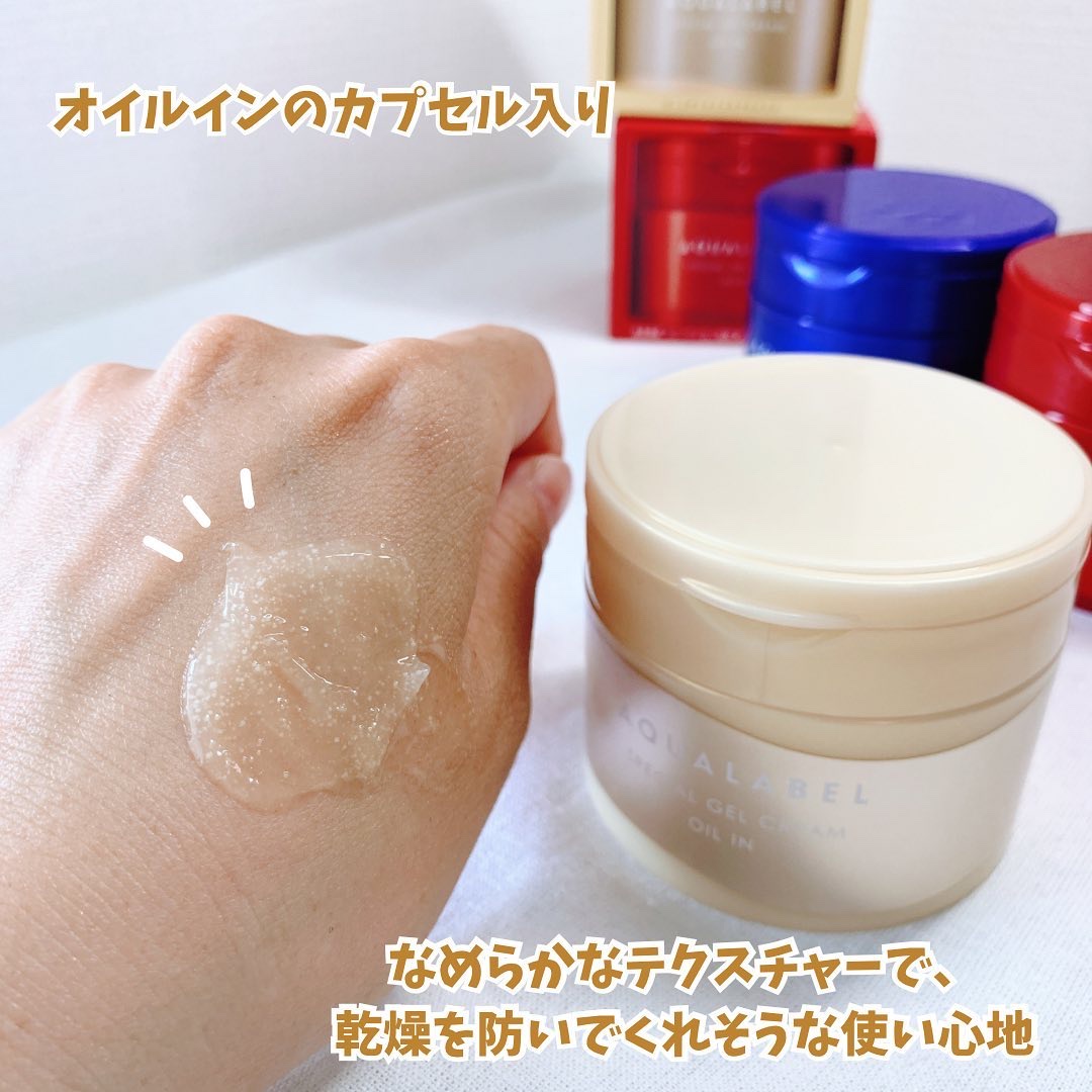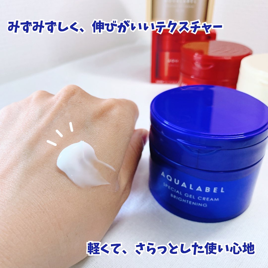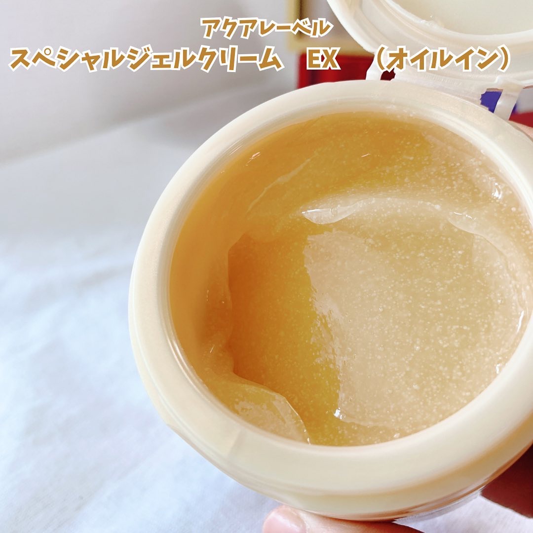 アクアレーベルのオールインワンは3種類ありますが、今回いただいたのは黄色のエイジングケア向けタイプ! テクスチャーはジェル状で、つぶつぶが入っています。このつぶつぶは刺激もなく塗り広げてしまうとなじんでしまって全くわかりません。 オールインワンだからお手入れがこれひとつで済ませられるのも本当に嬉しい!!助かる!!