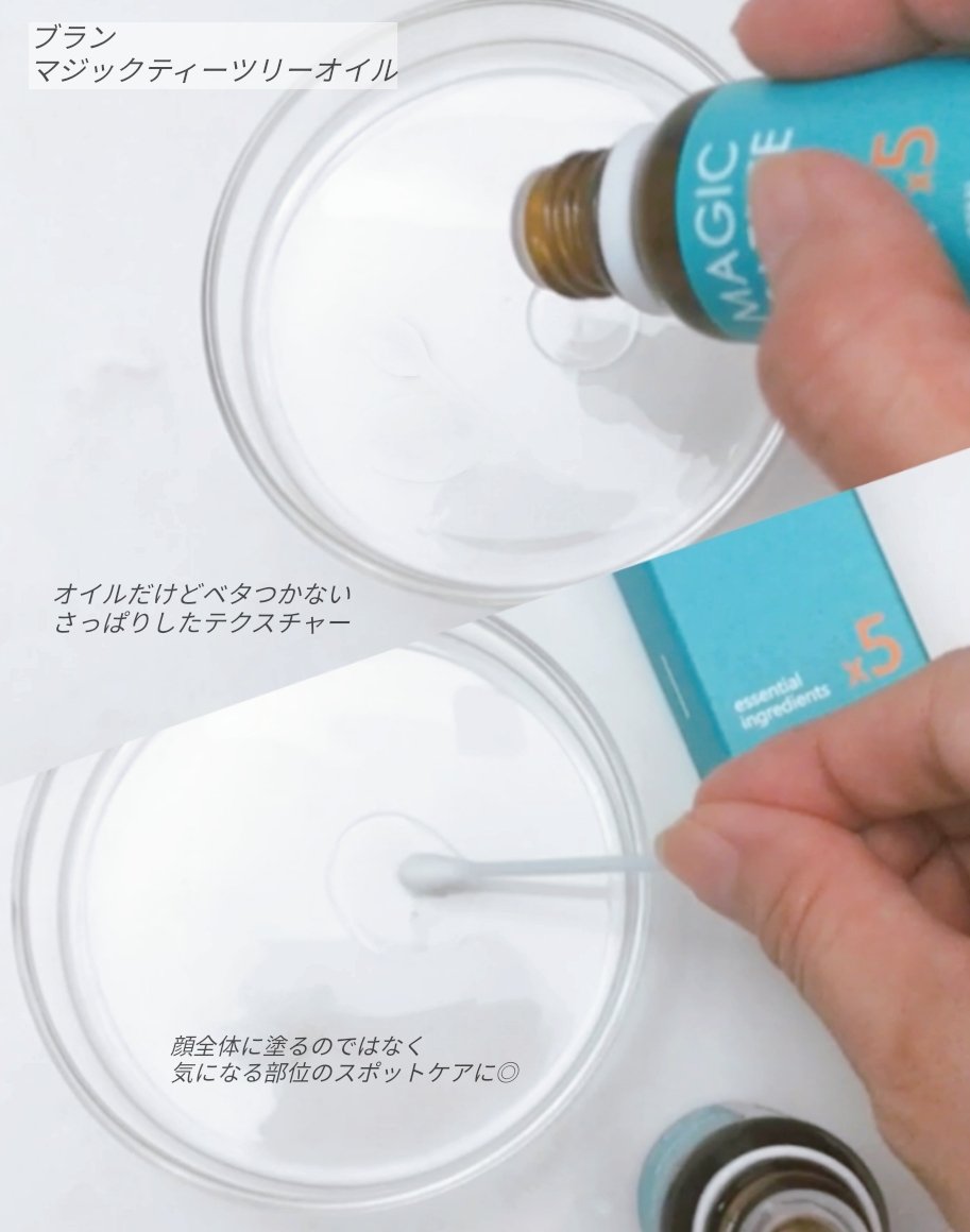 - マジックティーツリーオイルは、乾燥や皮脂による肌悩みをスポットケアし、整える商品です。ブラン代表の整肌成分である4‐テルピネオールで肌トラブルの原因の1つである皮脂を素早くケアします。 【このような方におススメ】 ✔乾燥による肌悩みが気になる方 ✔過度な皮脂と油分が気になる方 ✔べたつきのないスキンケアを探されている方 ✔肌荒れを防ぎたい方 ✔年齢性別肌タイプ関係なく使用できる商品を探されている方 【使用方法】 ①洗顔後、コットンに適量を取り、軽くふき取った後馴染ませます。 ②気になる部分の肌をきれいに洗顔後、トナー→クリームの順でお肌を整えます。 ③綿棒に1~2滴落とし、気になる部分に塗ります。 経過を見て朝晩のスキンケアの最後の段階に塗ることを繰り返します。