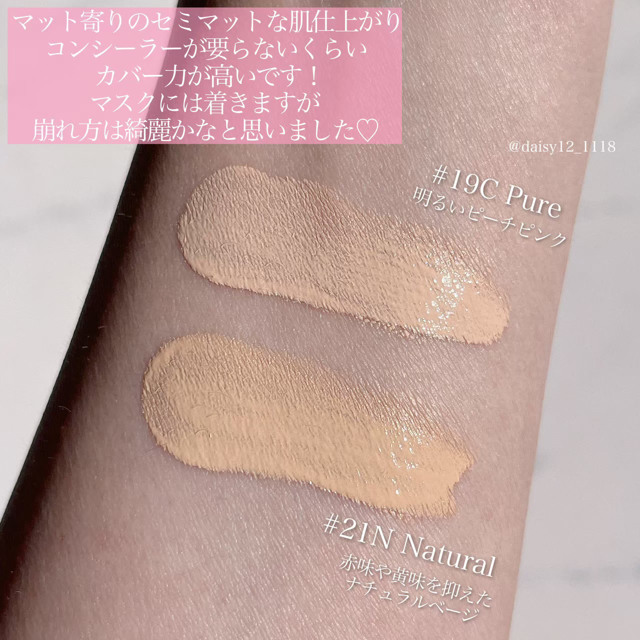 - <#19C ピュア> 水、シクロペンタシロキサン、酸化チタン、イソドデカン、トリメチルシロキシケイ酸、ジメチコン、プロパンジオール、エチルヘキサン酸セチル、ナイアシンアミド、1,2-ヘキサンジオール、PEG/PPG-18/18ジメチコン、PEG-10ジメチコン、酸化鉄、(アクリレーツ/メタクリル酸ポリトリメチルシロキシ)コポリマー、硫酸Mg、ポリグリセリル-3ポリジメチルシロキシエチルジメチコン、オクチルドデカノール、ジステアルジモニウムヘクトライト、合成フルオロフロゴパイト、水酸化Al、香料、ステアリン酸、アルミナ、トリエトキシカプリリルシラン、ポリヒドロキシステアリン酸、イソステアリン酸ポリグリセリル-4、アデノシン、エチレンジアミンジコハク酸3Na、トリイソステアリン酸イソプロピルチタン、ジエチルヘキサン酸ネオペンチルグリコール、BG、ヤマザクラ花エキス、ヒアルロン酸Na、ヒアルロン酸、アスコルビン酸 <#21N ナチュラル> 水、シクロペンタシロキサン、酸化チタン、イソドデカン、トリメチルシロキシケイ酸、ジメチコン、プロパンジオール、エチルヘキサン酸セチル、ナイアシンアミド、1,2-ヘキサンジオール、酸化鉄、PEG/PPG-18/18ジメチコン、PEG-10ジメチコン、(アクリレーツ/メタクリル酸ポリトリメチルシロキシ)コポリマー、オクチルドデカノール、硫酸Mg、ポリグリセリル-3ポリジメチルシロキシエチルジメチコン、ジステアルジモニウムヘクトライト、合成フルオロフロゴパイト、水酸化Al、香料、ステアリン酸、アルミナ、トリエトキシカプリリルシラン、イソステアリン酸ポリグリセリル-4、ポリヒドロキシステアリン酸、トリイソステアリン酸イソプロピルチタン、アデノシン、エチレンジアミンジコハク酸3Na、ジエチルヘキサン酸ネオペンチルグリコール、BG、ヤマザクラ花エキス、ヒアルロン酸Na、ヒアルロン酸、アスコルビン酸 <#23BE ベージュ> 水、シクロペンタシロキサン、酸化チタン、イソドデカン、トリメチルシロキシケイ酸、ジメチコン、プロパンジオール、エチルヘキサン酸セチル、ナイアシンアミド、酸化鉄、1,2-ヘキサンジオール、PEG/PPG-18/18ジメチコン、PEG-10ジメチコン、オクチルドデカノール、(アクリレーツ/メタクリル酸ポリトリメチルシロキシ)コポリマー、硫酸Mg、ポリグリセリル-3ポリジメチルシロキシエチルジメチコン、ジステアルジモニウムヘクトライト、合成フルオロフロゴパイト、水酸化Al、香料、ステアリン酸、アルミナ、トリエトキシカプリリルシラン、イソステアリン酸ポリグリセリル-4、ポリヒドロキシステアリン酸、トリイソステアリン酸イソプロピルチタン、アデノシン、エチレンジアミンジコハク酸3Na、ジエチルヘキサン酸ネオペンチルグリコール、BG、ヤマザクラ花エキス、ヒアルロン酸Na、ヒアルロン酸、アスコルビン酸
