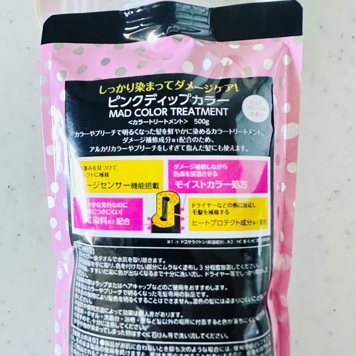 - <シルバー> 水、セテアリルアルコール、グリセリン、セバシン酸ジエチルヘキシル、水添ポリイソブテン、シクロペンタシロキサン、BG、アモジメチコン、ベヘントリモニウムクロリド、ポリクオタニウムー37、加水分解ケラチン(羊毛)、加水分解シルク、加水分解コラーゲン、γードコサラクトン、液状ラノリン、(加水分解シルク/PGプロピルメチルシランジオール)クロスポリマー、アルガニアスピノサ核油、シア脂、ハチミツ、アルギニン、トコフェロール、フィトステロールズ、カプリル酸グリセリル、乳酸、ポリクオタニウムー7、グアーヒドロキシプロピルトリモニウムクロリド、ステアルトリモニウムクロリド、ジステアリルジモニウムクロリド、ステアリン酸グリセリル、塩化Na、ビスセテアリルアモジメチコン、ジメチコン、プロパンジオール、イジプロパノール、エタノール、フェノキシエタノール、安息香酸Na、香料、(+/-)塩基性青99、塩基性茶16、塩基性赤76、塩基性紫2、HC青2 <パープル> 水、グリセリン、セタノール、パルミチン酸エチルヘキシル、ステアリルアルコール、ベヘントリモニウムクロリド、ジメチコン、白金、γ-ドコサラクトン、シア脂、ハチミツ、アルガニアスピノサ核油、フィトステロールズ、アルギニン、乳酸、PEG-90M、アモジメチコン、ステアルトリモニウムクロリド、ポリソルベート80、ジステアリルジモニウムクロリド、プロパンジオール、イソプロパノール、エタノール、フェノキシエタノール、香料、(+/-)塩基性青124、塩基性赤51、塩基性黄57、HC黄4、HC青2、塩基性紫2 <ピンク> 水、グリセリン、セタノール、パルミチン酸エチルヘキシル、ステアリルアルコール、ベヘントリモニウムクロリド、ジメチコン、白金、γ-ドコサラクトン、シア脂、ハチミツ、アルガニアスピノサ核油、フィトステロールズ、アルギニン、乳酸、PEG-90M、アモジメチコン、ステアルトリモニウムクロリド、ポリソルベート80、ジステアリルジモニウムクロリド、プロパンジオール、イソプロパノール、エタノール、フェノキシエタノール、香料、(+/-)塩基性青124、塩基性赤51、塩基性黄57、HC黄4、HC青2、塩基性紫2 <ミルクティー> 水、セテアリルアルコール、グリセリン、セバシン酸ジエチルヘキシル、水添ポリイソブテン、シクロペンタシロキサン、BG、アモジメチコン、ベヘントリモニウムクロリド、ポリクオタニウムー37、加水分解ケラチン(羊毛)、加水分解シルク、加水分解コラーゲン、γードコサラクトン、液状ラノリン、(加水分解シルク/PGプロピルメチルシランジオール)クロスポリマー、アルガニアスピノサ核油、シア脂、ハチミツ、アルギニン、トコフェロール、フィトステロールズ、カプリル酸グリセリル、乳酸、ポリクオタニウムー7、グアーヒドロキシプロピルトリモニウムクロリド、ステアルトリモニウムクロリド、ジステアリルジモニウムクロリド、ステアリン酸グリセリル、塩化Na、ビスセテアリルアモジメチコン、ジメチコン、プロパンジオール、イジプロパノール、エタノール、フェノキシエタノール、安息香酸Na、香料、(+/-)塩基性青99、塩基性茶16、塩基性赤76、塩基性紫2、HC青2