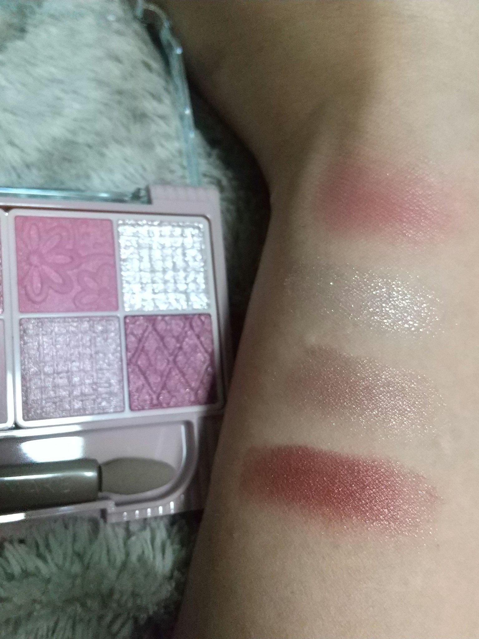 左上、左下、真ん中上、真ん中下、右上、右下という順番でスウォッチしてみました。 出してみると商品の写真より肌にのせたほうがくすみが出るかな✨という印象です😌 伸ばしやすくて指でも筆でもつけやすいです☺️💕 とっても可愛いカラーなのでオススメです💠