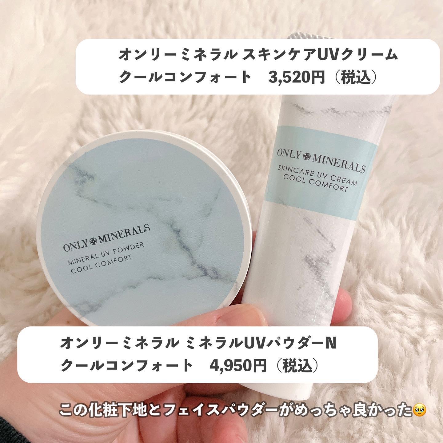 肌が敏感になっている時もやさしい使い心地のオンリーミネラルから、毎年夏に大人気のクールコンフォートシリーズが今年も登場♡ ひんやり🧊すること♡汗をかくとひんやりするそうで、今の時期に使うとちょっと寒い🥶笑 下地はナチュラルにトーンアップもしてくれるのでノーファンデの時にも良さそうです☆