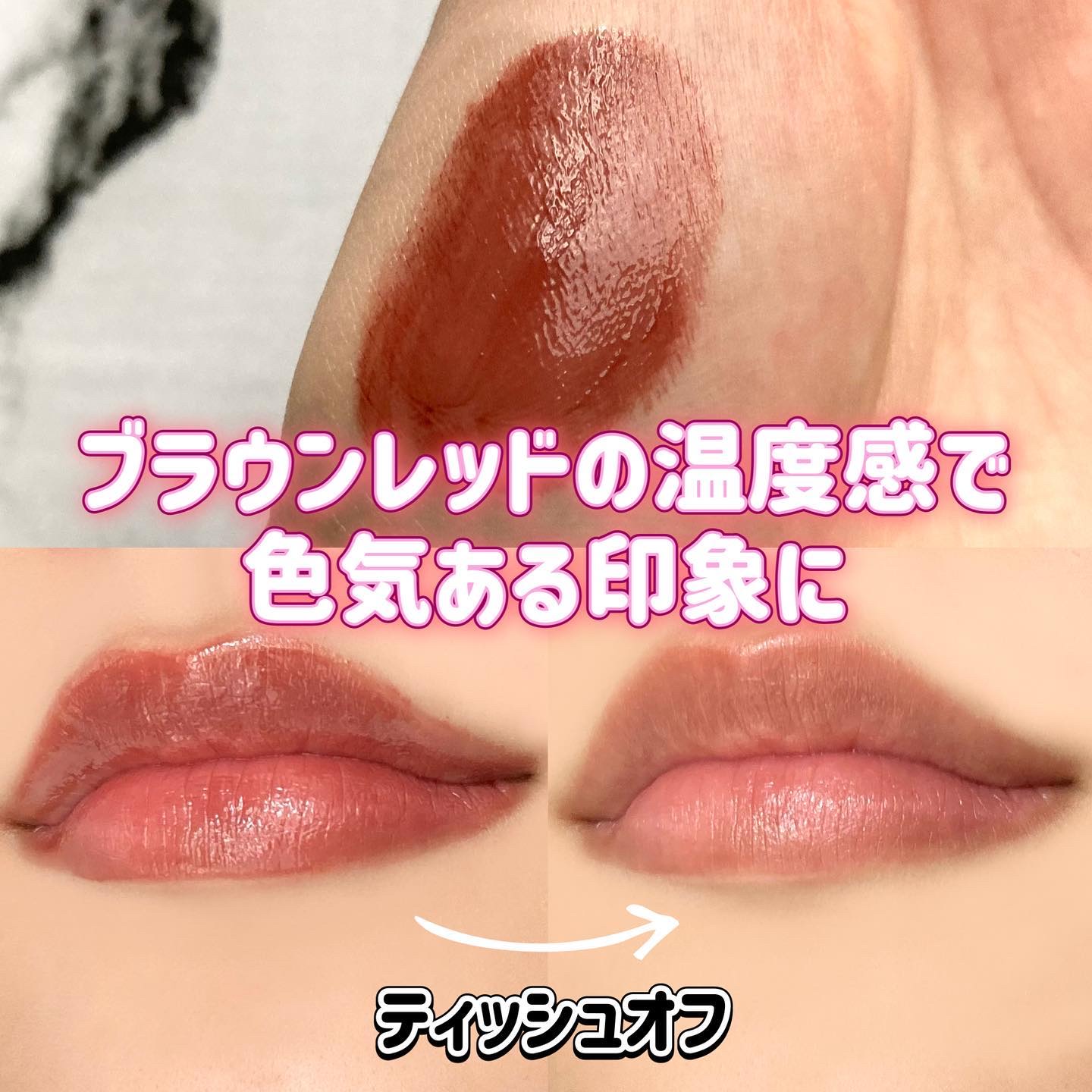 塗ってみると、とろけるようなテクスチャーで表面にちゅるんとしたツヤが出ました! 透け感があるため暗い色なのに明るい雰囲気になりました! ティッシュオフすると色付きリップなので色は落ちますが、ツヤが少し残っているので汚い感じにはならなかったです。 細かいラメが入っているのも可愛いです✨