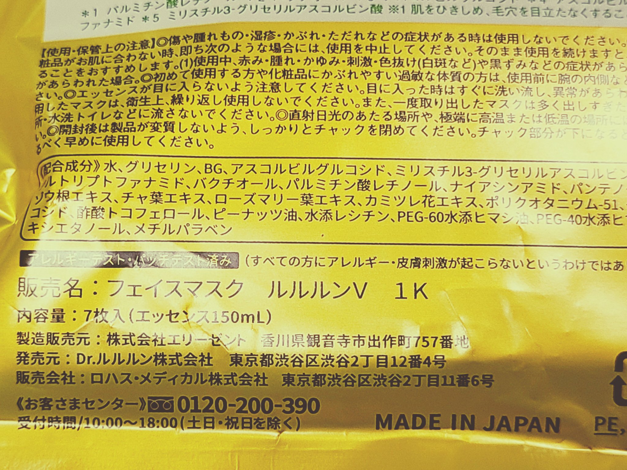 - <7枚入> 水、グリセリン、BG、アスコルビルグルコシド、ミリスチル3-グリセリルアスコルビン酸、アスコルビルメチルカルボニルペンタぺプチド-72-トリ-t-ブチルトリプトファナミド、バクチオール、バルミチン酸レチノール、ナイアシンアミド、パンテノール、ツボクサエキス、オウゴン根エキス、イタドリ根エキス、カンゾウ根エキス、チャ葉エキス、ローズマリー葉エキス、カミツレ花エキス、ポリクオタニウム-51、グリコシルトレハロース、加水分解水添デンプン、グリセリルグルコシド、酢酸トコフェロール、ピーナッツ油、水添レシチン、PEG-60水添ヒマシ油、PEG-40水添ヒマシ油、キサンタンガム、EDTA-2Na、クエン酸、クエン酸Na、フェノキシエタノール、メチルパラベン <28枚入> 水、グリセリン、BG、アスコルビルグルコシド、ミリスチル3-グリセリルアスコルビン酸、アスコルビルメチルカルボニルペンタぺプチド-72-トリ-t-ブチルトリプトファナミド、バクチオール、バルミチン酸レチノール、ナイアシンアミド、パンテノール、ツボクサエキス、オウゴン根エキス、イタドリ根エキス、カンゾウ根エキス、チャ葉エキス、ローズマリー葉エキス、カミツレ花エキス、ポリクオタニウム-51、グリコシルトレハロース、加水分解水添デンプン、グリセリルグルコシド、酢酸トコフェロール、ピーナッツ油、水添レシチン、PEG-60水添ヒマシ油、PEG-40水添ヒマシ油、キサンタンガム、EDTA-2Na、クエン酸、クエン酸Na、フェノキシエタノール、メチルパラベン