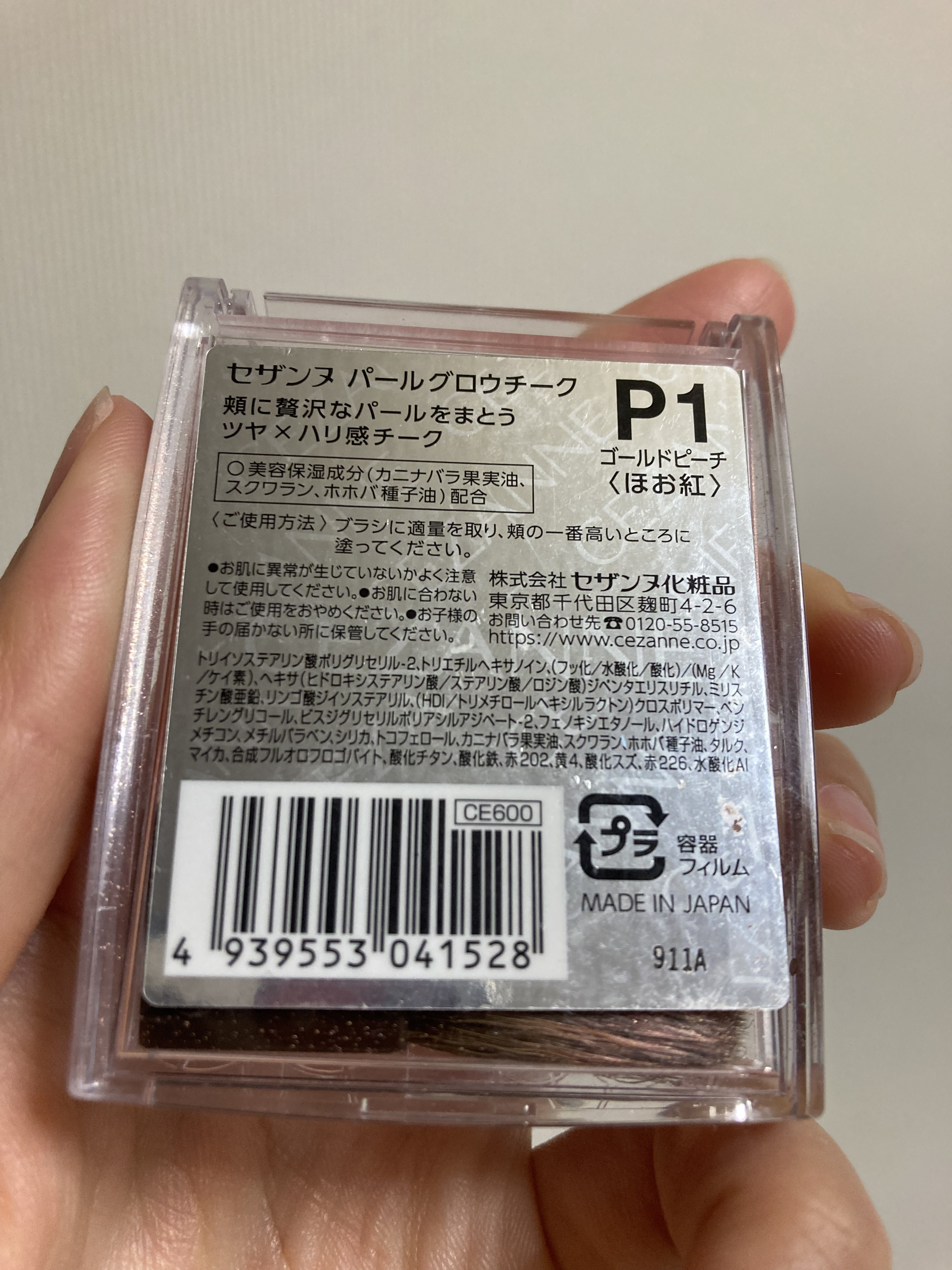 - <P1 ゴールドピーチ> トリイソステアリン酸ポリグリセリル-2、トリエチルヘキサノイン、(フッ化/水酸化/酸化)/(Mg/K/ケイ素)、ヘキサ(ヒドロキシステアリン酸/ステアリン酸/ロジン酸)ジペンタエリスリチル、ミリスチン酸亜鉛、リンゴ酸ジイソステアリル、(HDI/トリメチロールヘキシルラクトン)クロスポリマー、ペンチレングリコール、ビスジグリセリルポリアシルアジペート-2、フェノキシエタノール、ハイドロゲンジメチコン、メチルパラベン、シリカ、トコフェロール、カニナバラ果実油、スクワラン、ホホバ種子油、タルク、マイカ、合成フルオロフロゴパイト、酸化チタン、酸化鉄、赤202、黄4、酸化スズ、赤226、水酸化Al <P2 ベージュコーラル> トリイソステアリン酸ポリグリセリル-2、トリエチルヘキサノイン、(フッ化/水酸化/酸化)/(Mg/K/ケイ素)、ヘキサ(ヒドロキシステアリン酸/ステアリン酸/ロジン酸)ジペンタエリスリチル、ミリスチン酸亜鉛、リンゴ酸ジイソステアリル、(HDI/トリメチロールヘキシルラクトン)クロスポリマー、ペンチレングリコール、ビスジグリセリルポリアシルアジペート-2、フェノキシエタノール、ハイドロゲンジメチコン、メチルパラベン、シリカ、トコフェロール、カニナバラ果実油、スクワラン、ホホバ種子油、タルク、マイカ、合成フルオロフロゴパイト、酸化チタン、酸化鉄、酸化スズ、赤202、赤226、水酸化Al <P3 シナモンオレンジ> トリイソステアリン酸ポリグリセリル-2、トリエチルヘキサノイン、(フッ化/水酸化/酸化)/(Mg/K/ケイ素)、ヘキサ(ヒドロキシステアリン酸/ステアリン酸/ロジン酸)ジペンタエリスリチル、ミリスチン酸亜鉛、リンゴ酸ジイソステアリル、(HDI/トリメチロールヘキシルラクトン)クロスポリマー、ペンチレングリコール、ビスジグリセリルポリアシルアジペート-2、フェノキシエタノール、ハイドロゲンジメチコン、メチルパラベン、シリカ、トコフェロール、カニナバラ果実油、スクワラン、ホホバ種子油、タルク、合成フルオロフロゴパイト、マイカ、酸化チタン、酸化鉄、グンジョウ、酸化スズ、赤226、赤202、水酸化Al