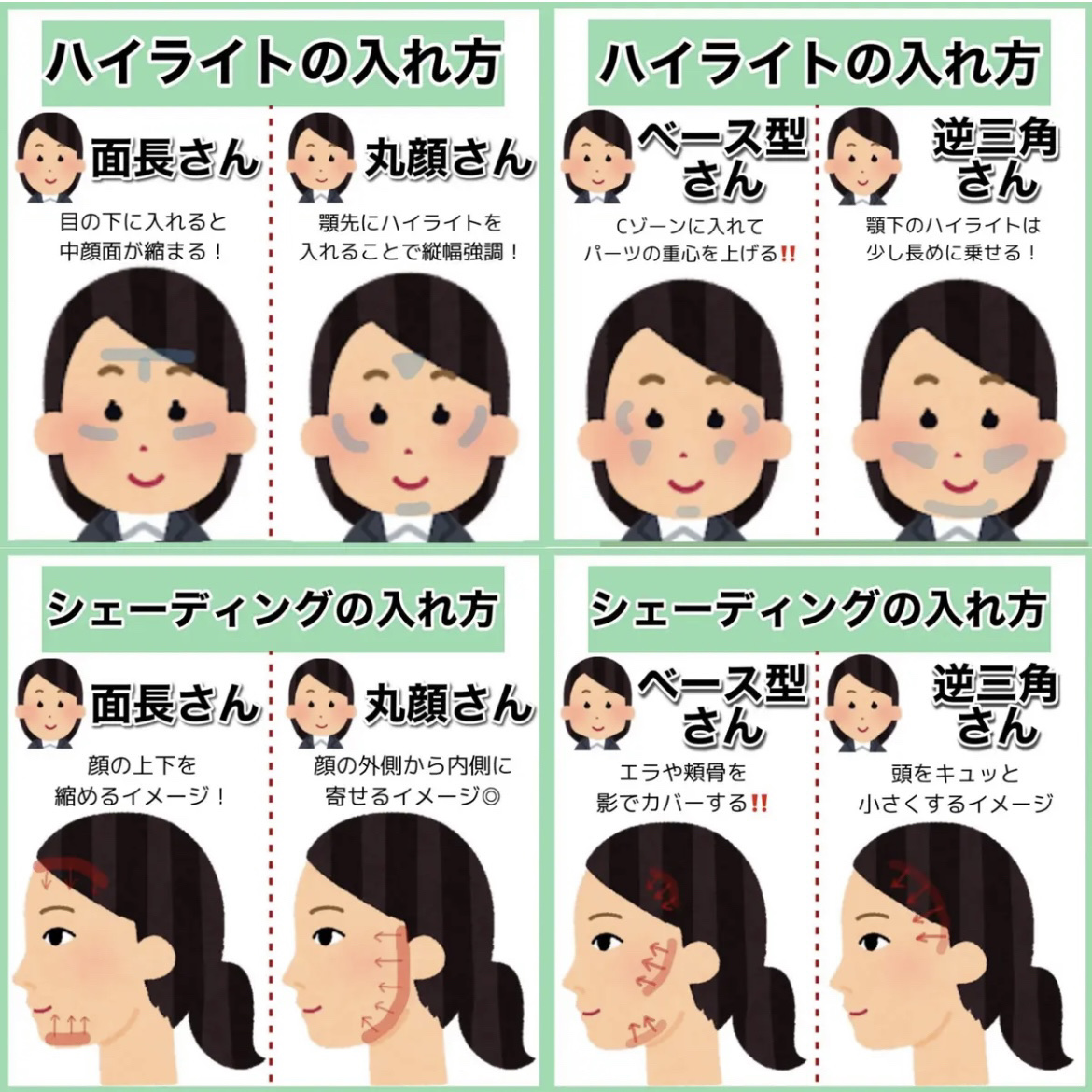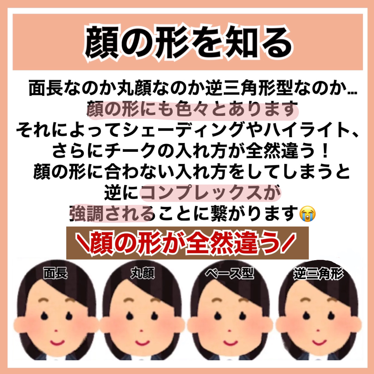 似合う前髪…センター分け 似合う髪型…ストレートヘア 丸顔さんは縦長を意識して丸みを解消してあげるとさらに可愛くなります🎀 似合う前髪…幅広めぱっつん 似合う髪型…くびれへア 面長さんは横幅を意識して縦長を解消してあげるとさらに可愛くなります🎀 似合う前髪…シースルー 似合う髪型…毛先ふんわりへア 逆三角形さんは下重心にしてハチ張りを解消してあげるとさらに可愛くなります🎀 似合う前髪…流し前髪 似合う髪型…レイヤー丸みへア 四角形さんはレイヤーでエラ張りを解消してあげるとさらに可愛くなります🎀 それぞれの気になる部分を前髪や髪型で隠してあげることで垢抜けた印象になります♡♡