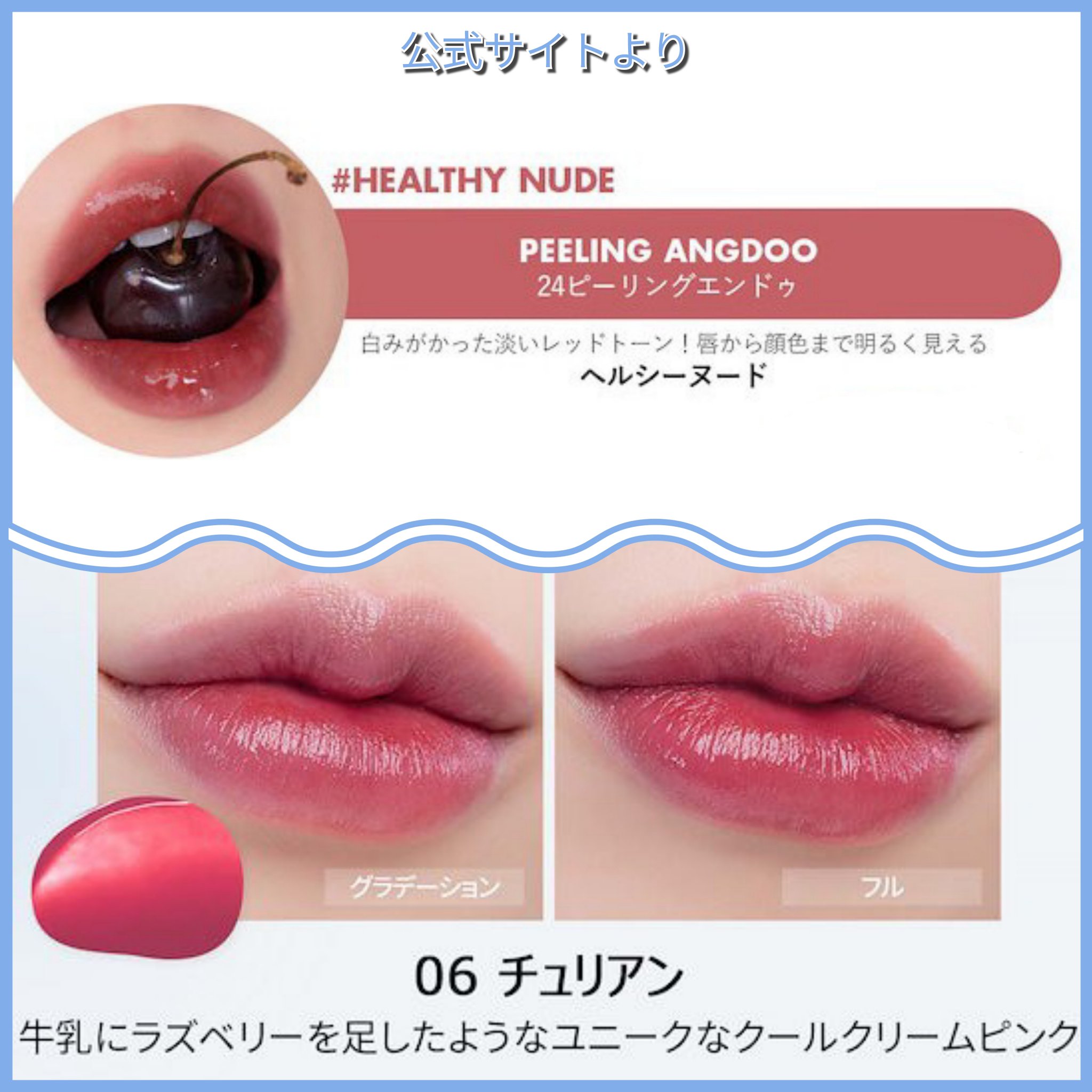 カラーバリエーションが豊富。 ジューシーな発色が特徴で、みずみずしい光沢。 ふっくらとしたボリュームのある唇に💋 お肌を明るく見せてくれるようなカラー。 黄みと青みのバランスが絶妙💛💙 肌色関係なく使える色だと思います。 透明感のあるカラーが濡れツヤ唇に👄 軽くつけるだけでナチュラルできれいな発色。 塗り重ねをしてもテクスチャーが重くなりなくいです。 ジューシーラスティングティントよりも保湿感👍 ベリー系ピンク🫐 少し青みのあるくすみピンクです。 やはりrom&ndのリップは最強ですね👑 どちらとも時間がたっても色落ちしにくいです。 きれいな唇の状態をキープしてくれます。 他にもたくさんのカラーが揃っているので見てみてください!