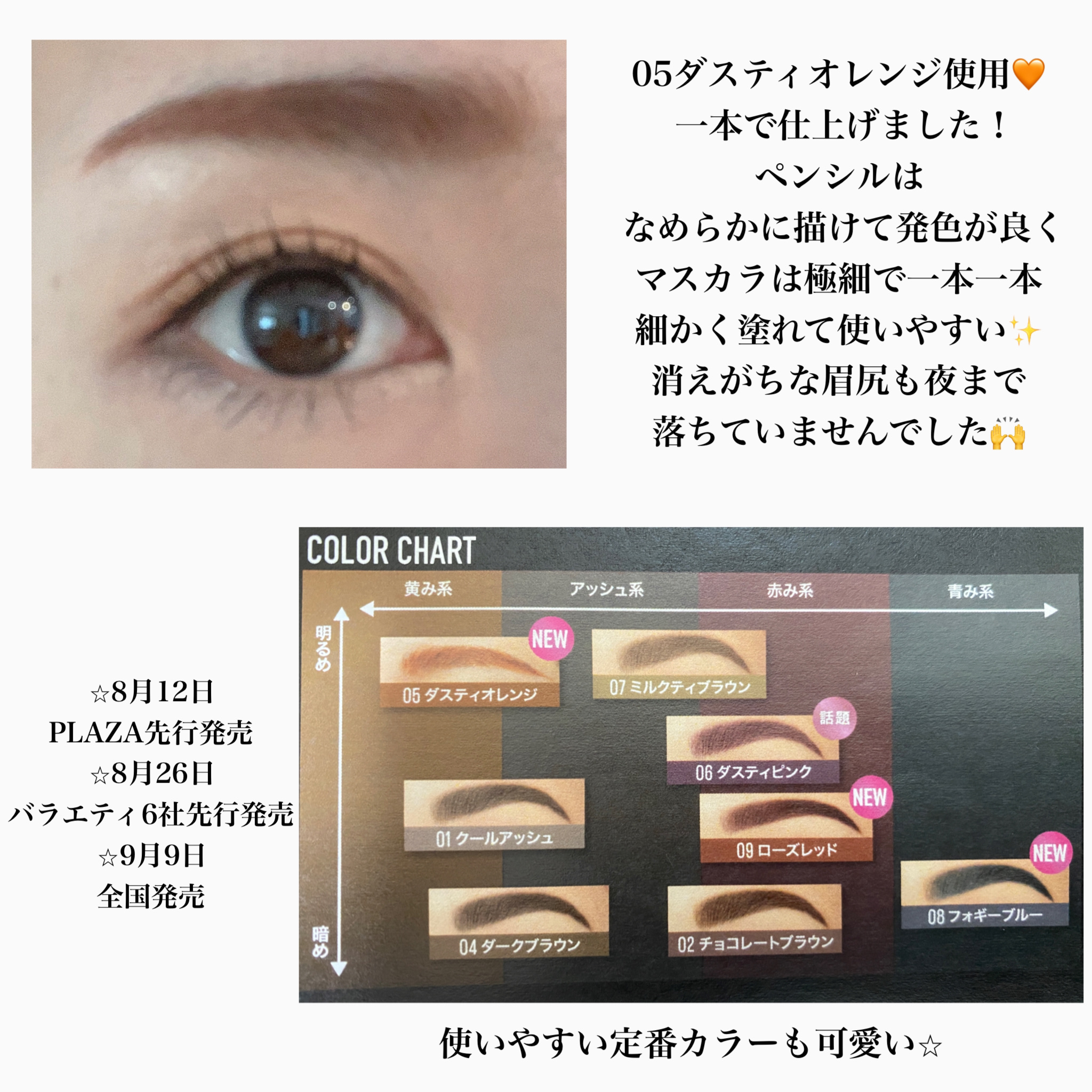 - 史上初*1 眉ペンシルと眉マスカラが1本に! STEP1:極細三角芯ペンシル 極細三角芯だから描きやすい! まばら眉も眉尻も自然に書き足せて、まるで自眉からキレイな仕上りへ*2 STEP 2: 高発色ジェルマスカラ ジェルティントフィルムが眉毛1本1本をコーティング。ブラシが小さく塗りやすいから、思い通りの毛流れにふんわりスタイリング。 さらに、水、こすれ、皮脂崩れにも夜までキレイ!*3 髪色、メイク、ファッションに合わせた6色展開 定番のアッシュブラウンからトレンドのくすみピンクまで。 *1 メイベリン ニューヨークにおいて。 *2 メイクアップ効果による印象。 *3 メイベリン ニューヨーク調べ。個人差があります。