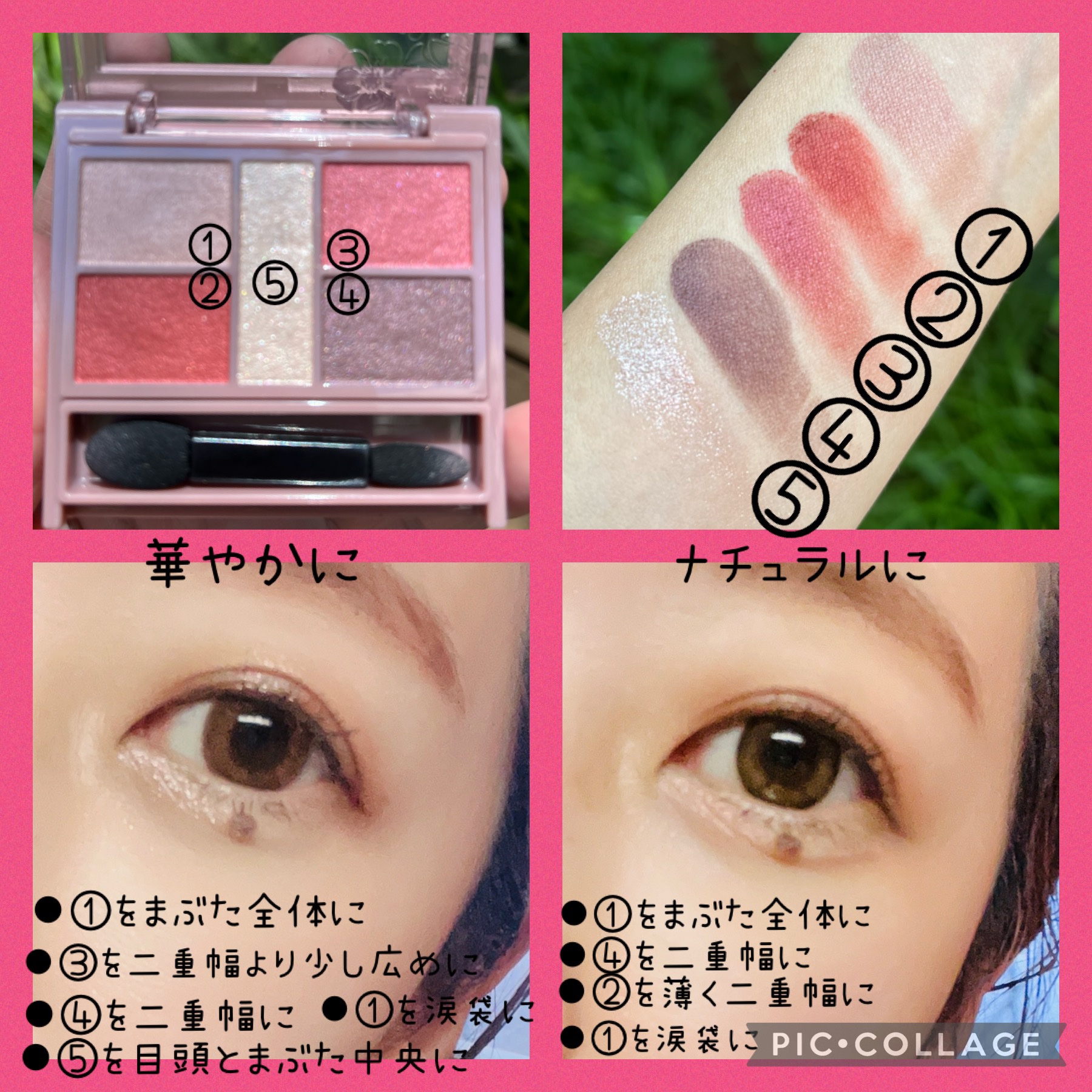 - 1枚のパレットで2つのスタイルが完成! 5色の欲ばりアイシャドウ♥ メインカラーを選んで2つのスタイルが楽しめる! A→B→D でスタイル1 A→C→D でスタイル2 繊細な粉質が、しっとりとまぶたに密着して色落ちを防ぎます。 透明感のあるキラうるトッピングジュエル(繊細ラメ)は、気分によってトッピング!