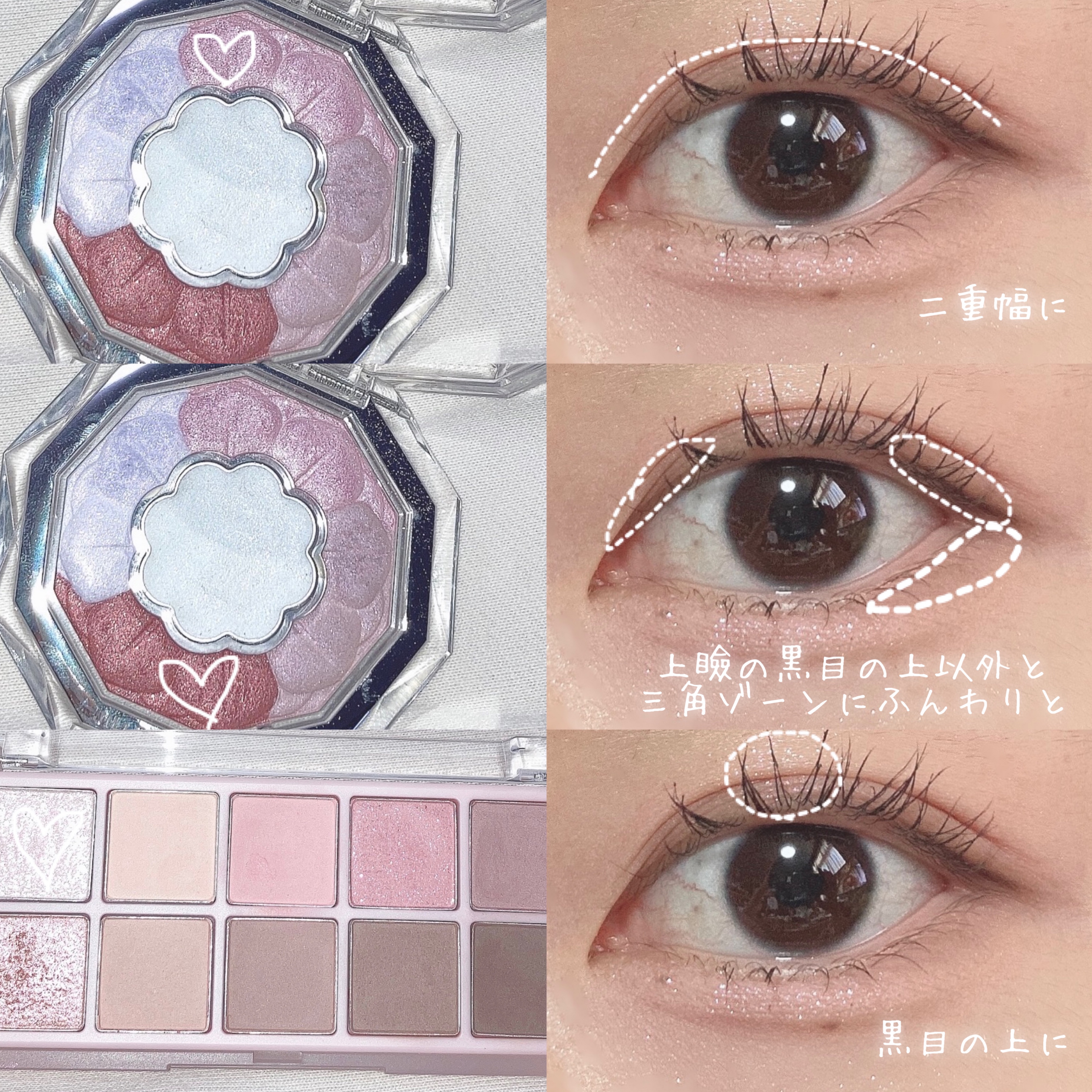 メインのピンクカラーは腫れぼったく見えないように上瞼の外側から三角ゾーンと涙袋の影を作るように塗りました! ラメはピンク系の色にすることでアイシャドウの色と合うようにしました😍 アイラインは少しだけ跳ね上げ風にすると甘すぎない印象で可愛いです💕