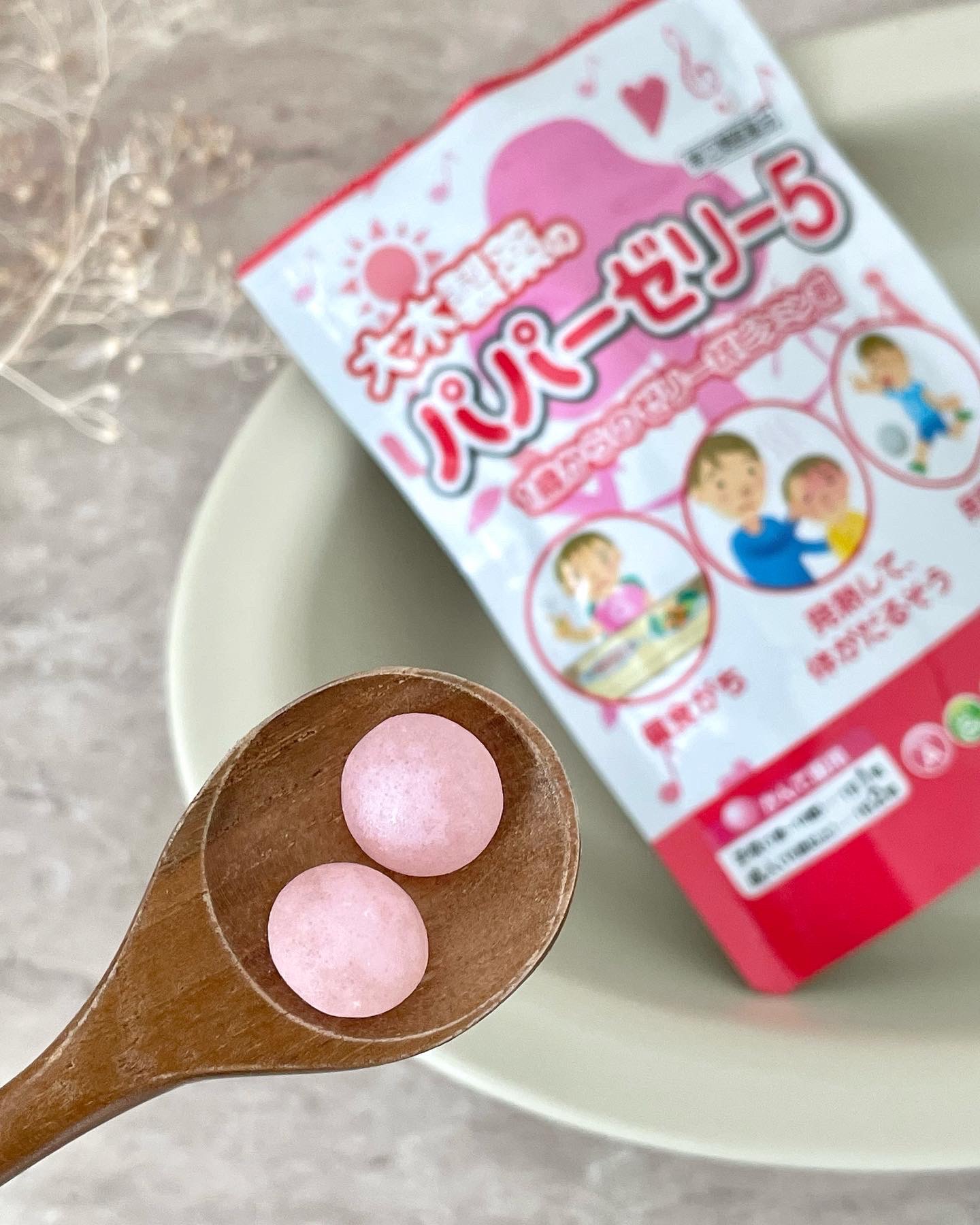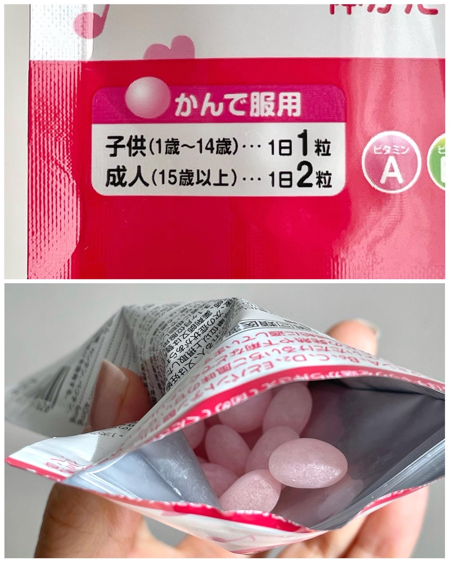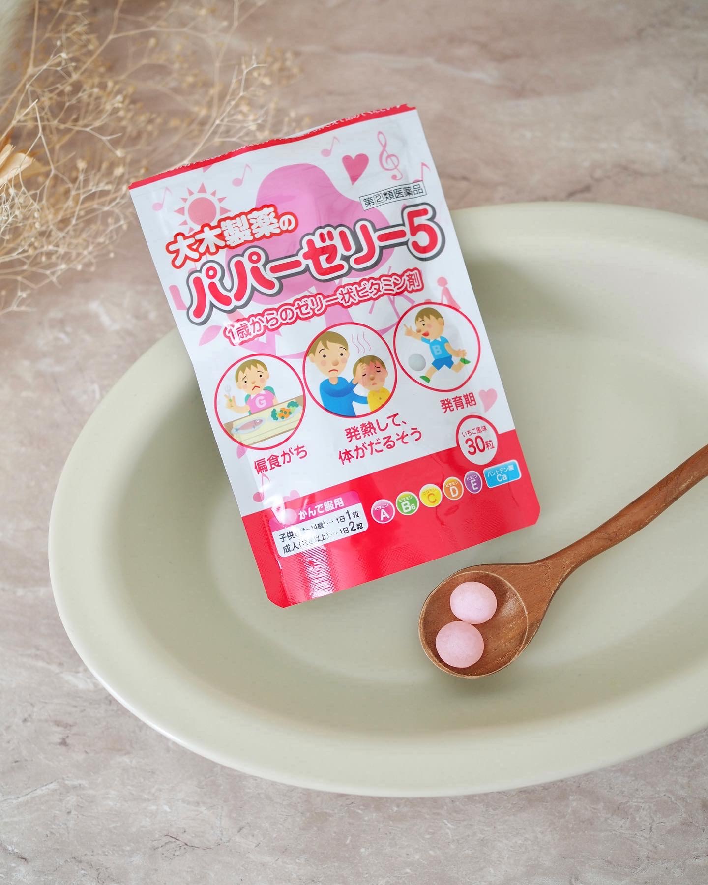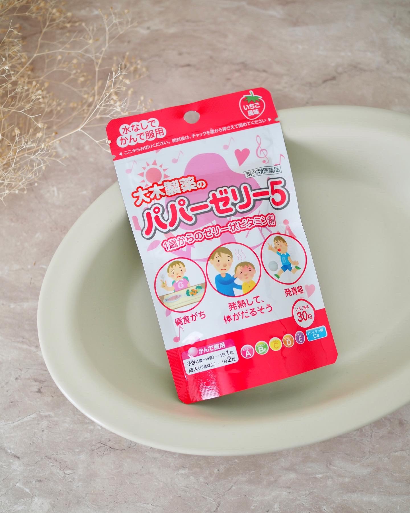 かんで容易に服用していただけるいちご風味の 甘いゼリー状ビタミン剤です。 平らな丸い形で、まわりが糖衣されてます。 噛むとやわらかいゼリーなので 小さいお子さんでも食べやすいかなぁ、 と思います。 自分の子供時代にも食べてた懐かしい味🎵
