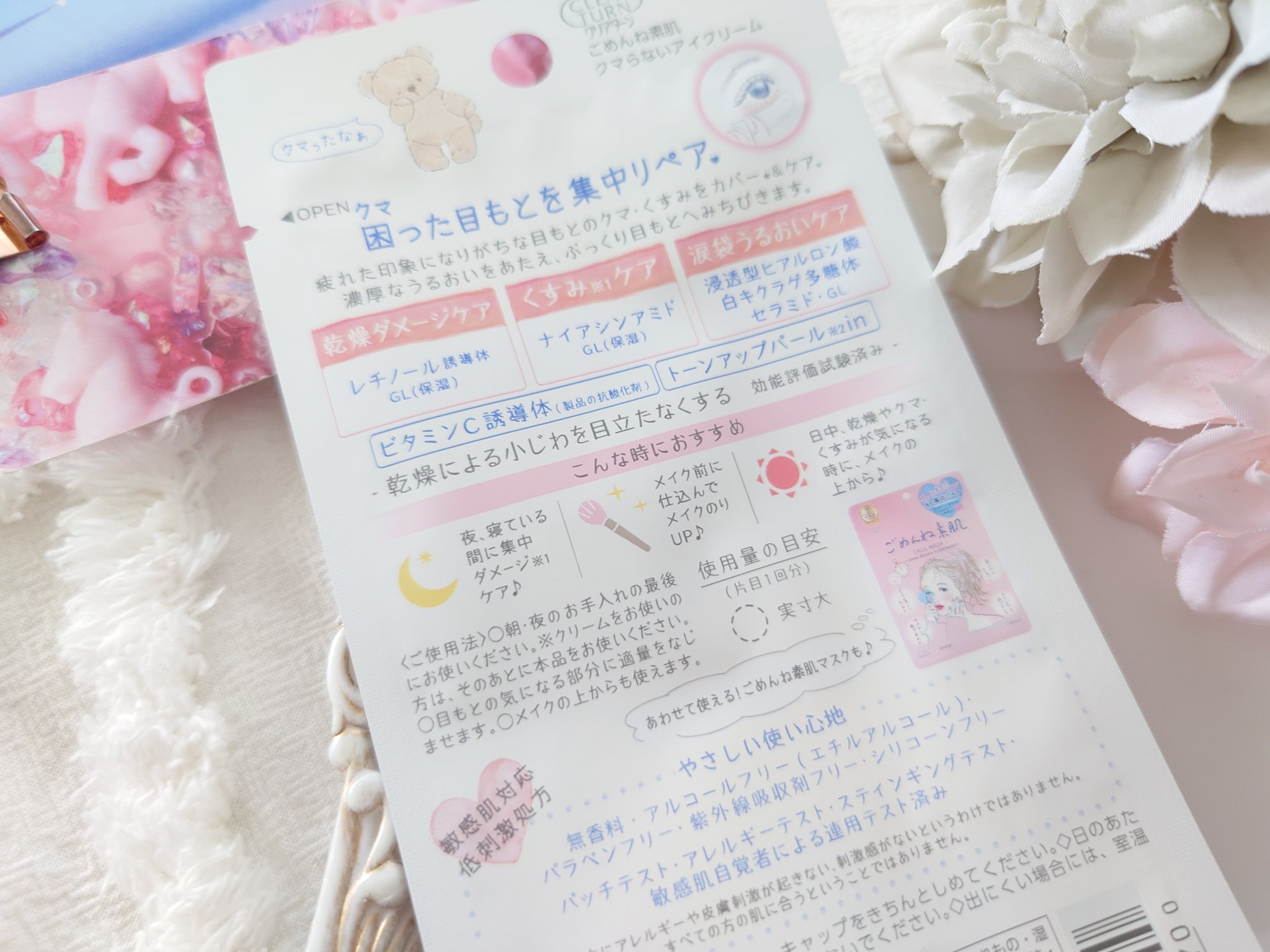 - 好調なごめんね素肌シリーズから、 若年層の目もと悩みを徹底ケアするアイクリームを新発売! ❶あらゆる目もと悩みを集中ケア!〈 乾燥ダメージ+くすみ※+涙袋うるおいケア 〉 濃厚なクリームで、乾燥やくすみ※の気にならない、ぷっくりうるおった目もとへみちびきます。 【乾燥ダメージケア】レチノール誘導体(保湿) 【くすみ※ケア】ナイアシンアミド・ビタミンC誘導体(保湿) 【涙袋うるおいケア】浸透型ヒアルロン酸・白キクラゲ多糖体・セラミド(保湿) ❷うるおいをあたえながら、クマ・くすみもカバー !※2すっぴんからキレイな目もとへ トーンアップパール配合!クマやくすみをナチュラルにカバーします。※2 ❸皮膚が薄く、デリケートな目もとにもやさしい使い心地 【低刺激処方】弱酸性 無香料 無鉱物油 アルコールフリー パラベンフリー(防腐剤) 紫外線吸収剤フリー シリコーンフリー 【各種試験済み】パッチテスト アレルギーテスト スティンギングテスト 敏感肌自覚者による連用テスト 乾燥小じわの効能評価試験済み (全ての方に、刺激やアレルギーなどが起きないというわけではありません) ※乾燥による ※2パールによるトーンアップ(メイク)効果のこと