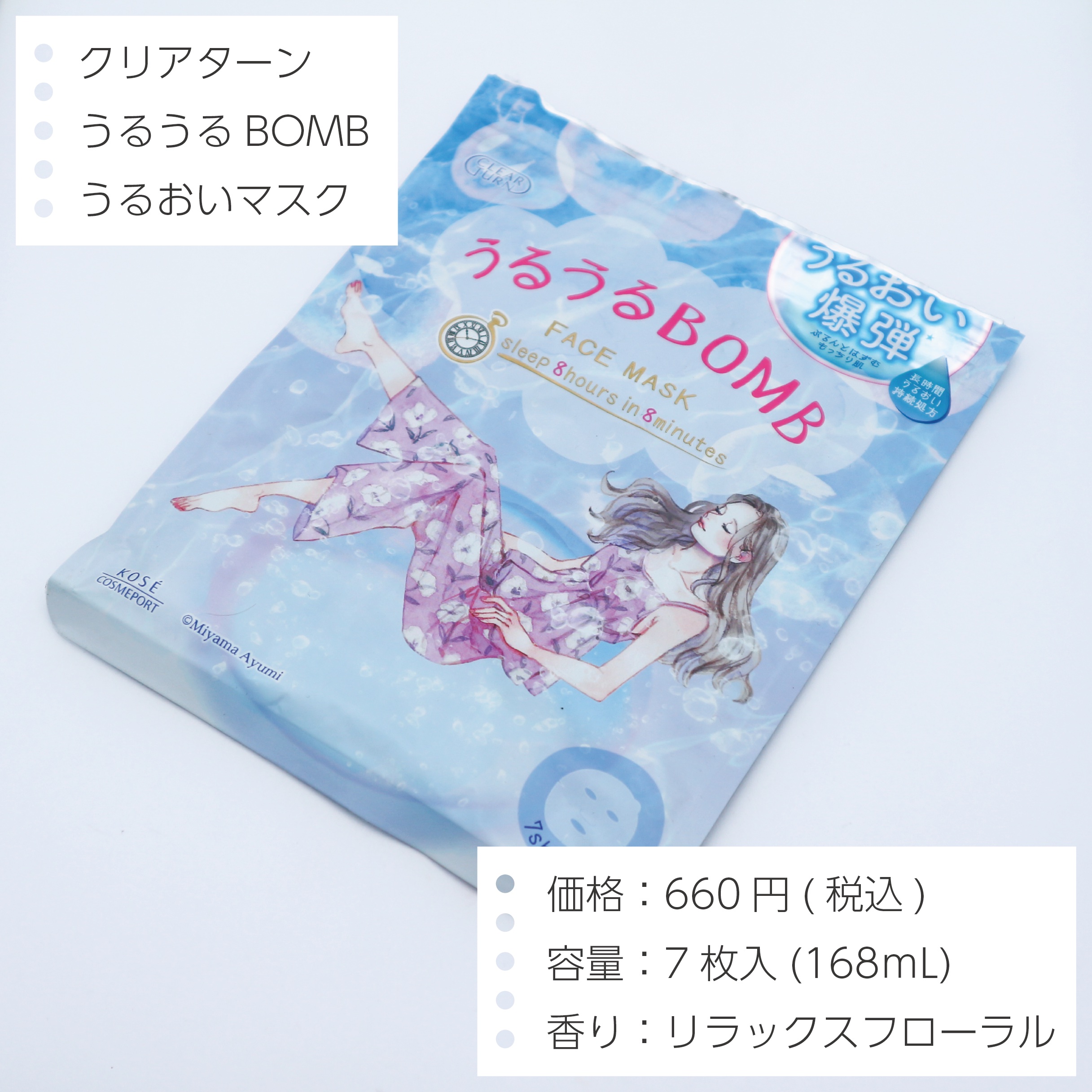 ✔クリアターンうるうるBOMBマスク7枚入りクリアターンのイラストシリーズ☺️こちらは保湿(潤い)に特化したパックです。潤い成分のセラミド、ヒアルロン酸が配合されていますが特に流行りの成分などはないかな?【白キクラゲ多糖体】ってのは初めて聞い...