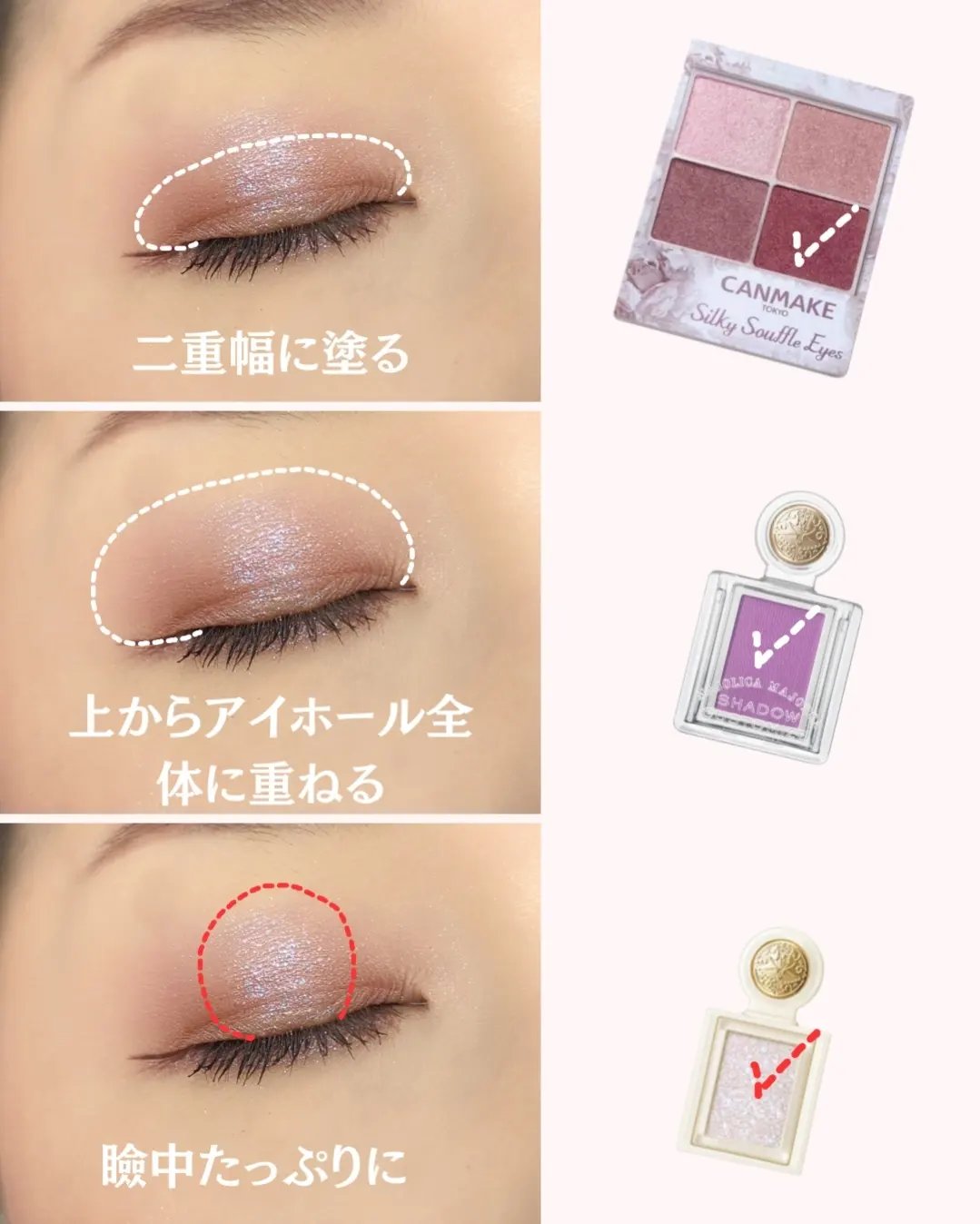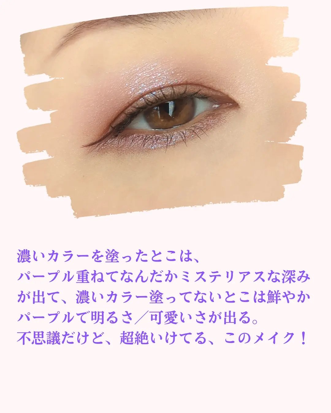キャンメイクのトパーズピンクだけだとピンク感強くて物足りなかったけど、紫のアイシャドウ重ねたら良いんですね!!!参考になります😭