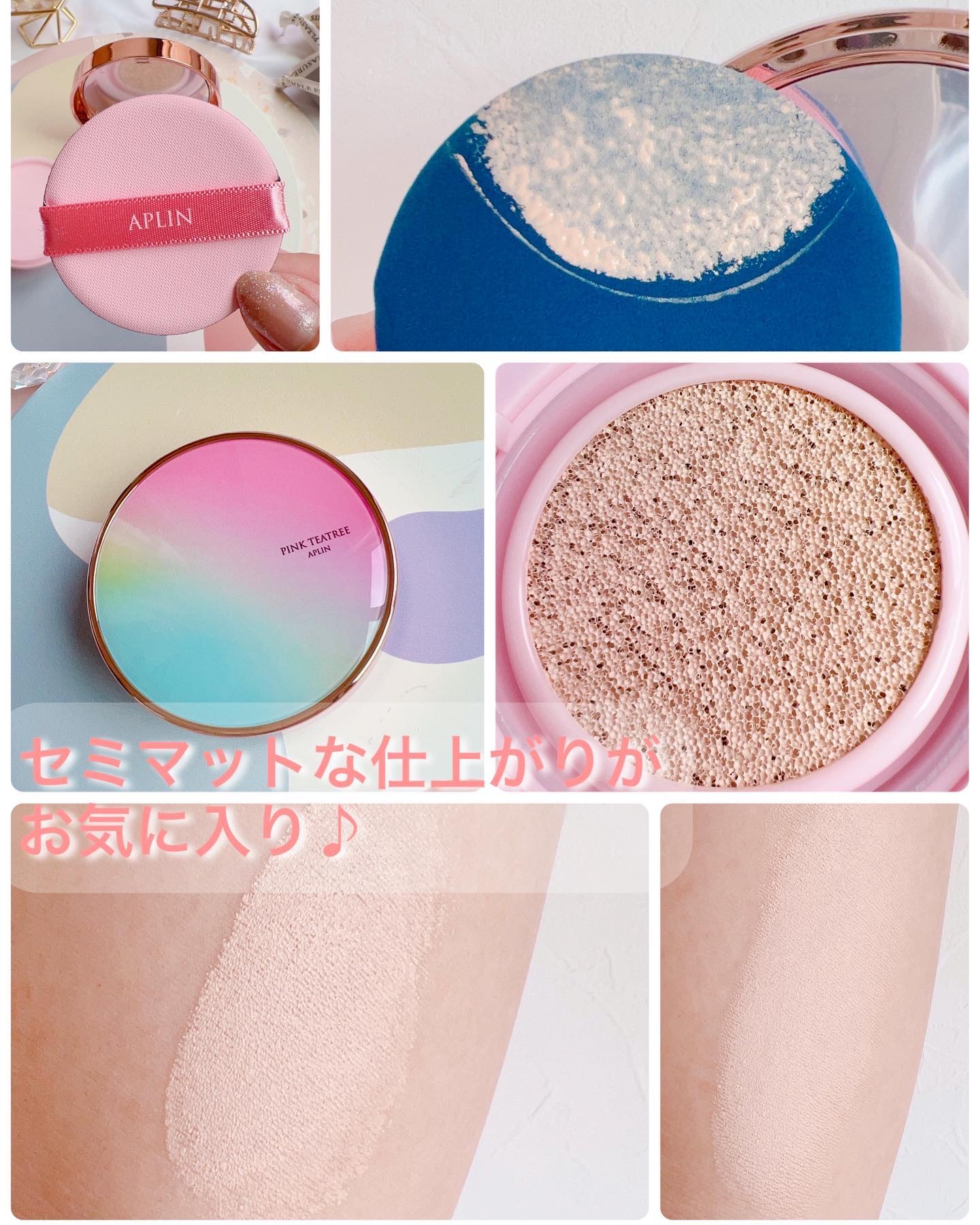 APLIN ピンクティーツリーカバークッション 21号ライトベージュ 2,490円(税込) 少量でよく伸びてハイカバー! 赤みやくすみをしっかりカバ一できるのに、厚塗り感のないなめらかな仕上がり♡ ハイカバーなのにナチュラルなツヤ感とサラッとしつつ、乾燥崩れしにくい仕上がりに感動します!!