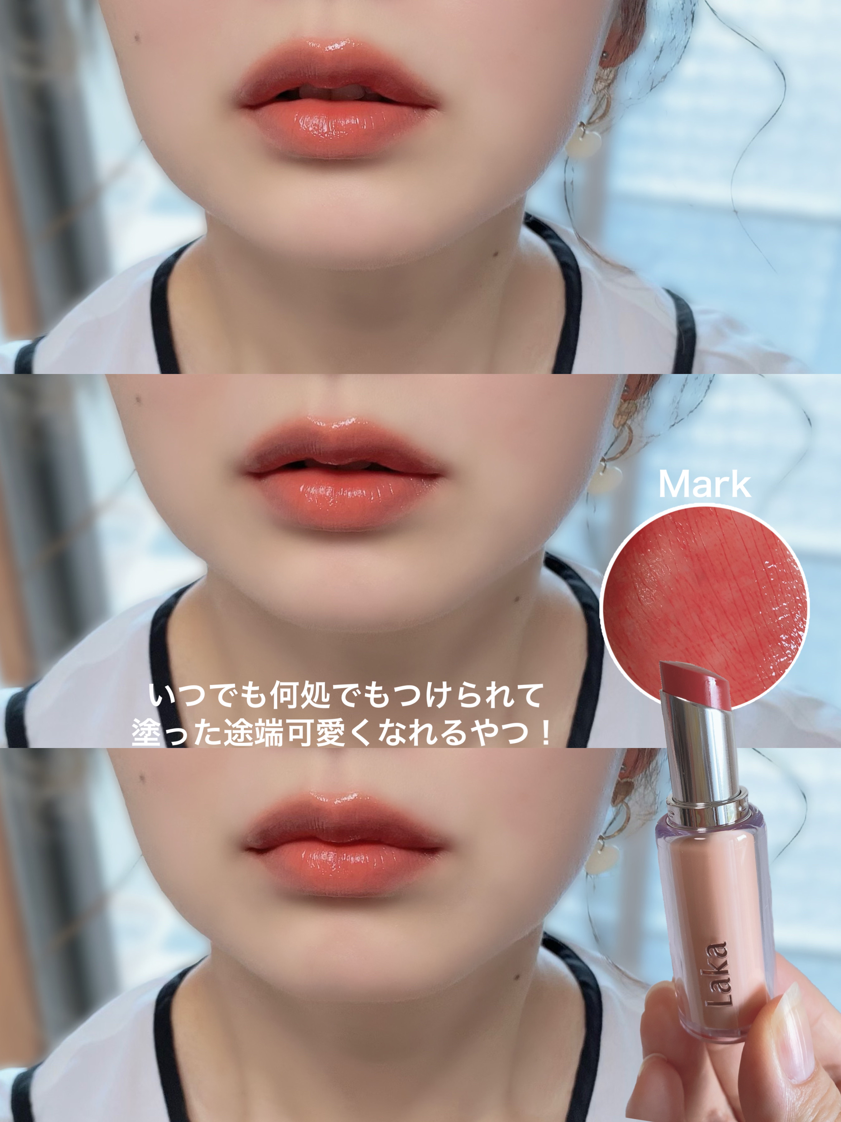 - Point1 透き通った気品が感じられるカラー ユニークなヌードカラーから自然なニュートラルカラー、深くて密度のあるポイントカラーまで、さまざまな好みに合わせた幅広いカラーバリエーション。それぞれのカラーが持つ明度や彩度に合わせて透明感を細かく調整しているため、グラデーションリップやオーバリップなど、プロが施したようなさまざまなリップメイクが楽しめます。また、夕方の暗い空間や、室内の光の下でも、唇本来の色にリップスティックのカラーが馴染み、水彩画のようなナチュラルな発色で、自然な血色感のある唇に演出します。 Point2 光に包まれたガラス玉のようなきらめき Lakaならではの「ボンディンググロウ」フォーミュラで、唇に触れた瞬間、体温でやさしく溶けていくようなテクスチャー。しっとりと馴染んで密着しながら唇をコーティングしてくれます。高い屈折率で光を強く反射させるハイシャインオイルコンプレックスを配合し、光沢感のある生き生きとしたリップカラーを実現しました。