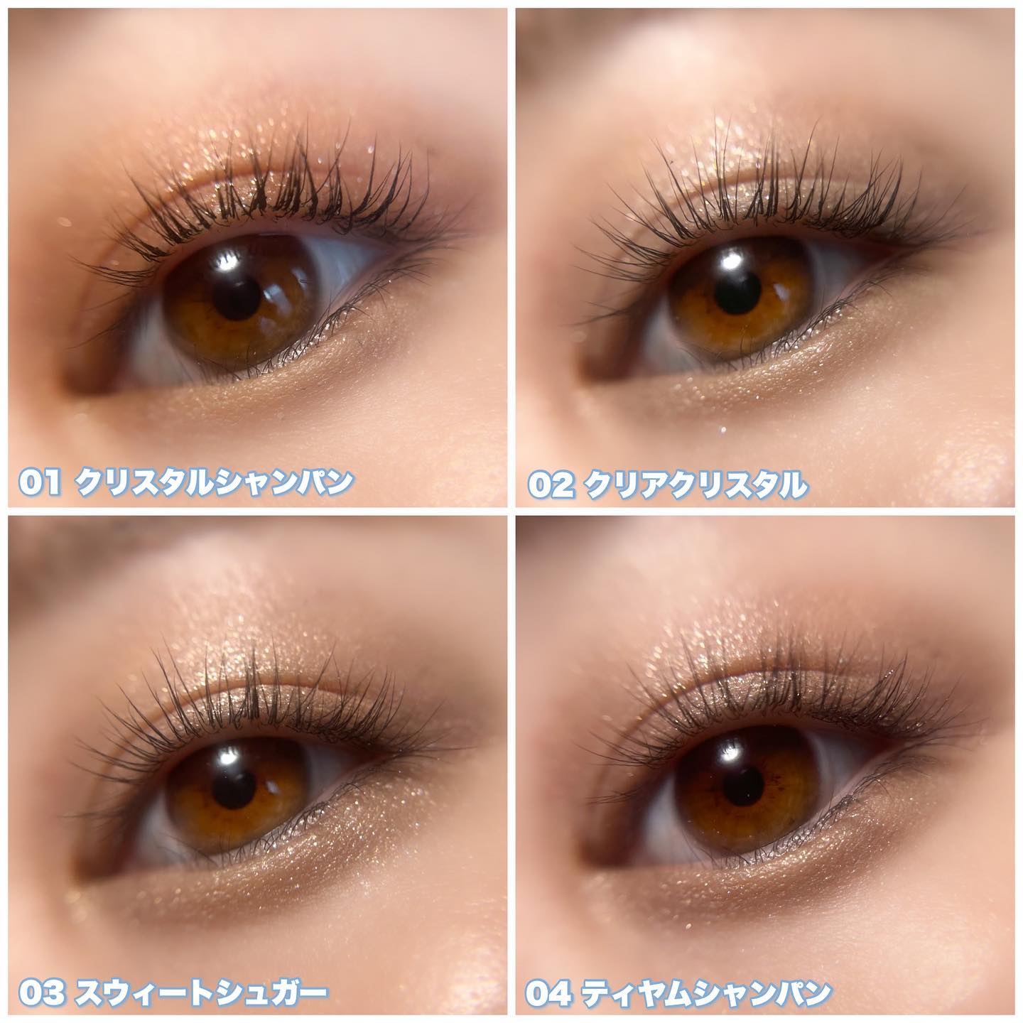 - まばゆい輝き、踊る色彩 グリッターシャドウ 01チラチラと輝く上品な煌めき 高輝度な大粒ラメや微細パールがまぶたの上でチラチラと輝き、上品なうるみEYEに。 単色使いはもちろん、レイヤードを楽しめます。 02長時間、ピタッと密着 パウダーでもクリームでもないやわらかいテクスチャーがまぶたにピタッと密着し、ラメ落ちを防ぎます。 03ラメを引き立たせるミュートカラーベース ベースカラーの発色を控えめにすることで、肌に馴染んで、ラメやパールの煌めきを引き立たせます。
