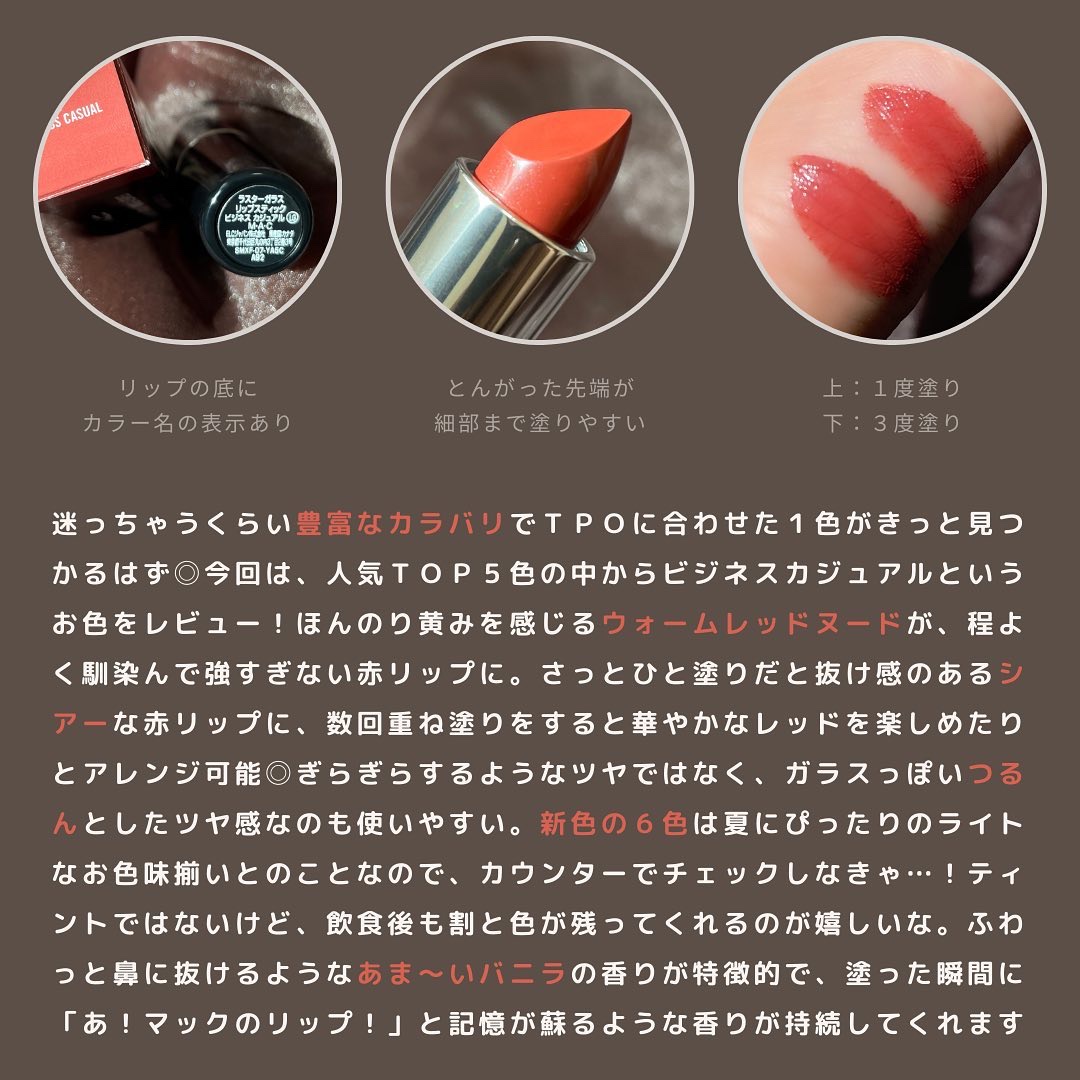 絶妙なカラー。レッドブラウン系ではあるけれど、オンオフ問わずに使える万能カラーです♡ スルスルと塗りやすく、程よくツヤがあるのも良きポイント◎ 気になっている色がまだまだあるので、引き続き購入を検討しています🙋♀️