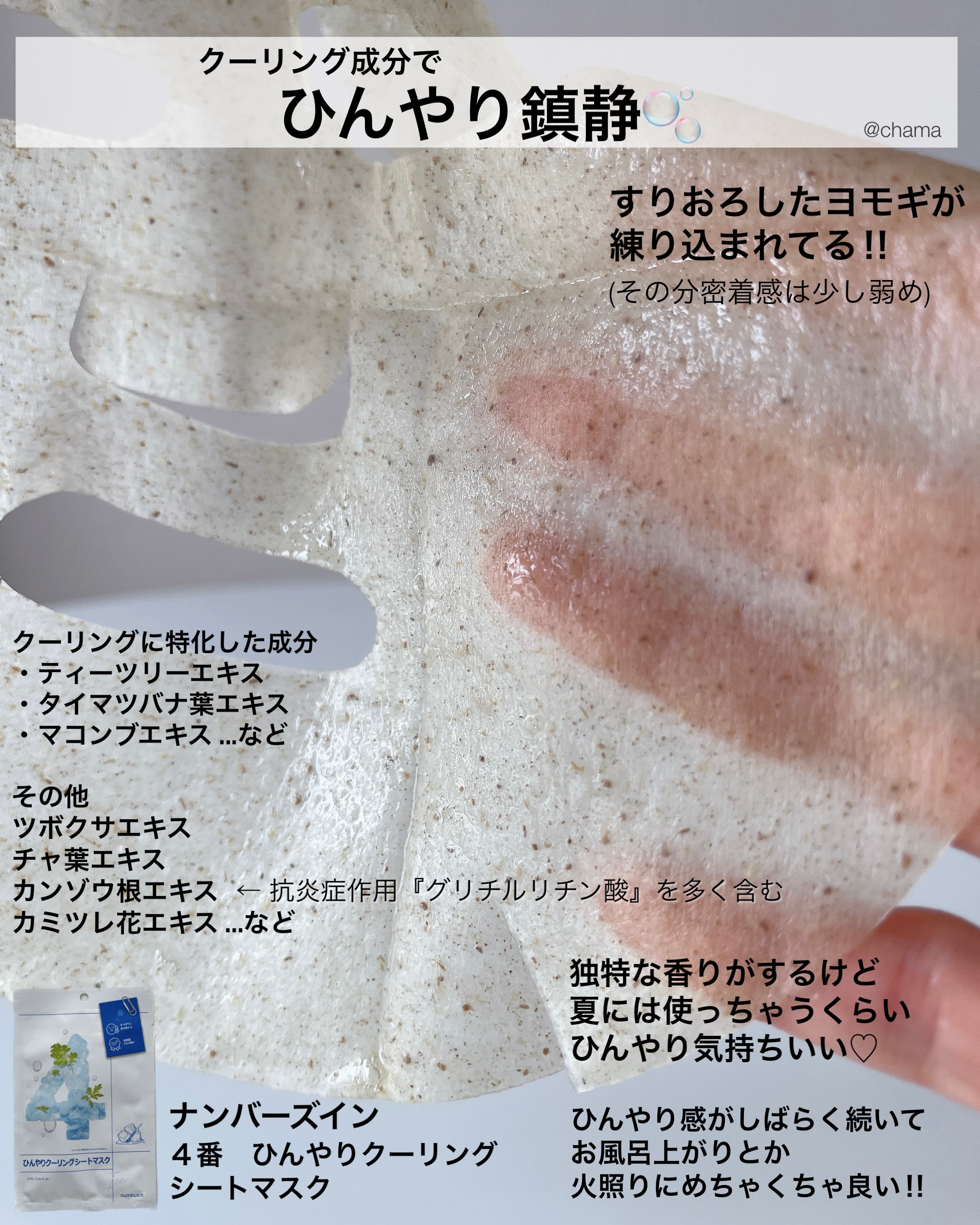 \お肌のクーリングケアにぴったり💙/夏の火照り肌にはナンバーズインの4番のマスクパック!よもぎがすりおろされたパックでさっぱりケア🌿ティーツリーやアデノシン、パンテノールなどの、整肌成分配合で肌を穏やかに整え、健やかな状態をサポート🧊ティーツ...