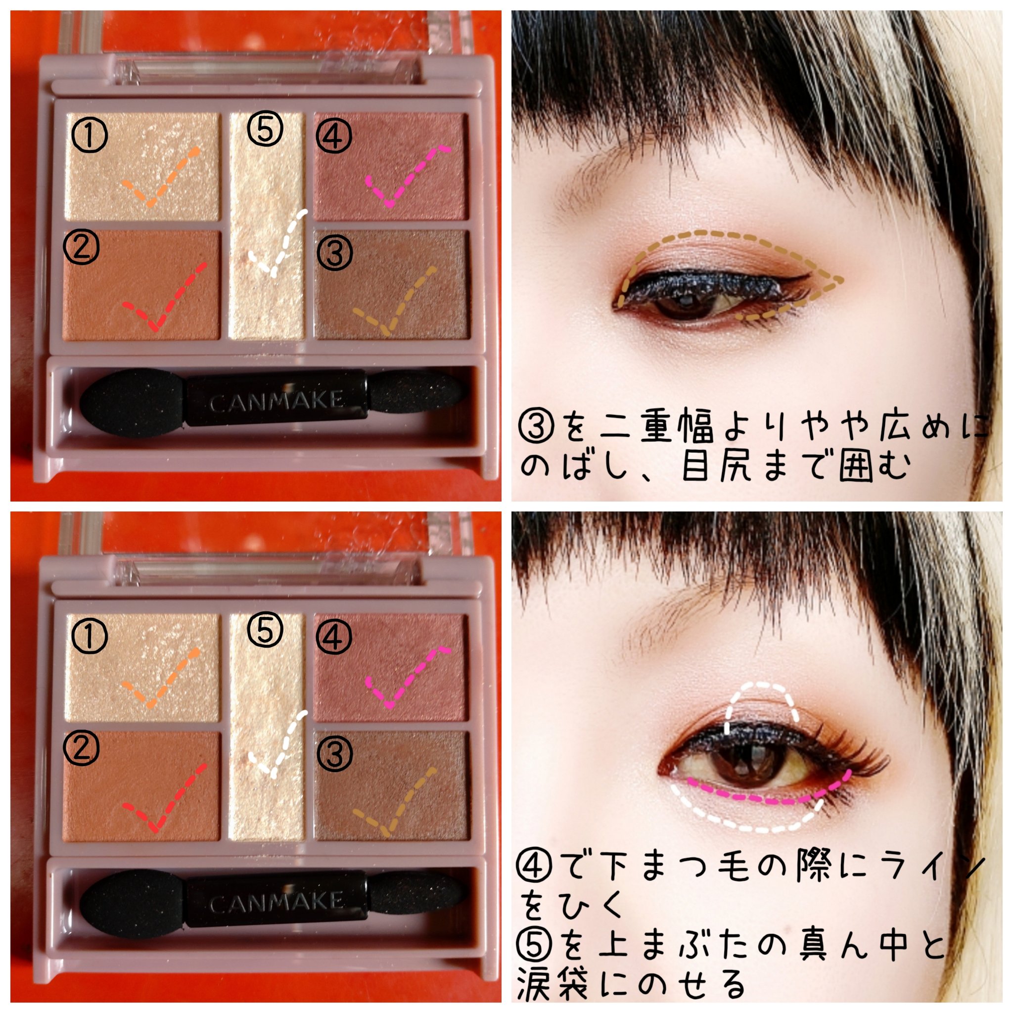 - 1枚のパレットで2つのスタイルが完成! 5色の欲ばりアイシャドウ♥ メインカラーを選んで2つのスタイルが楽しめる! A→B→D でスタイル1 A→C→D でスタイル2 繊細な粉質が、しっとりとまぶたに密着して色落ちを防ぎます。 透明感のあるキラうるトッピングジュエル(繊細ラメ)は、気分によってトッピング!