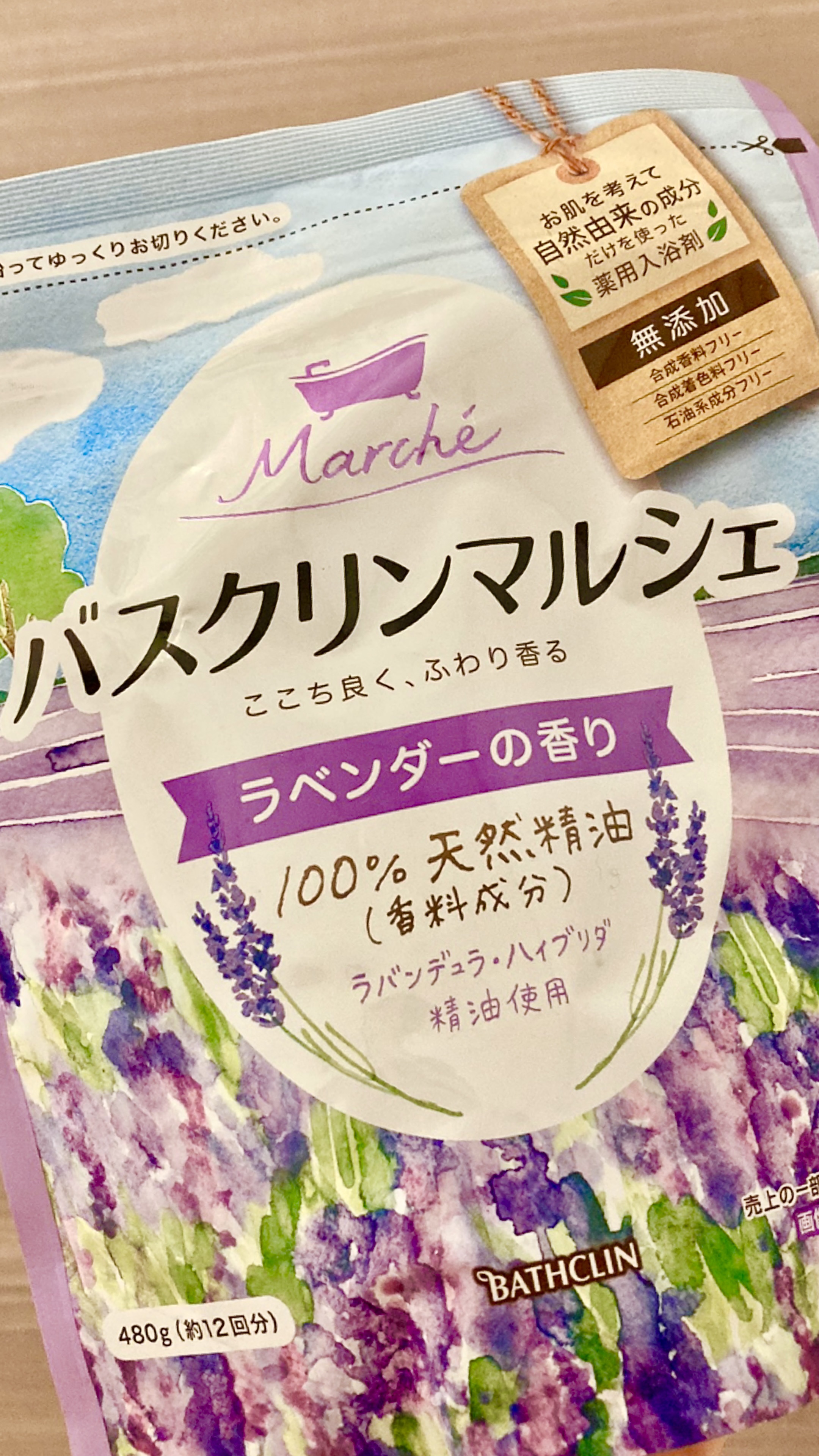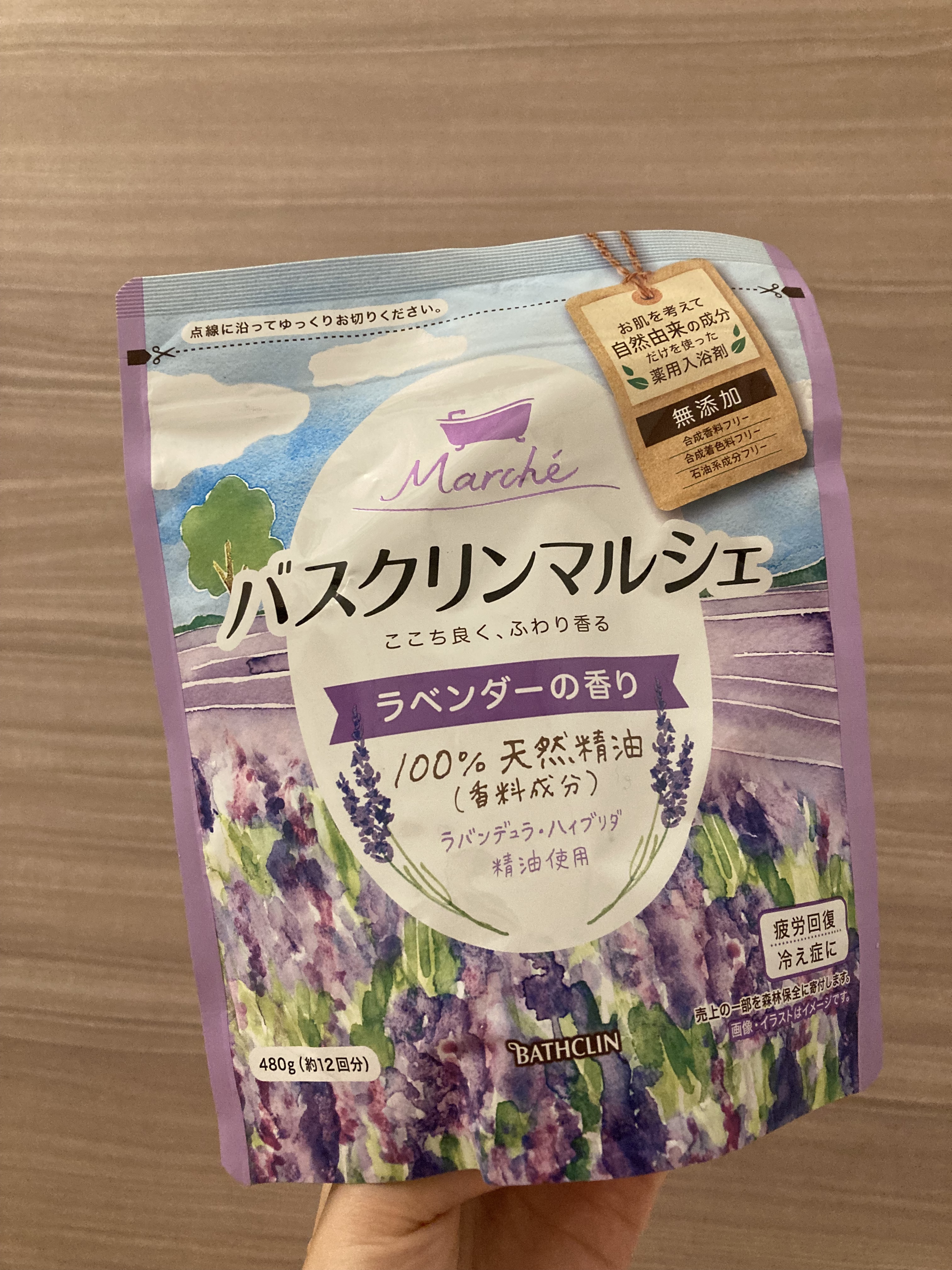 バスクリンマルシェラベンダーの香り480g438円オーガニック認証ホホバ油配合ごみが小さく捨てられるパウチそよ風に揺れる花を想わせる、華やかですっきりしたラベンダーの香り。湯色は黄色透明湯色が紫色ならよかったです。#バスクリン#バスクリンマル...