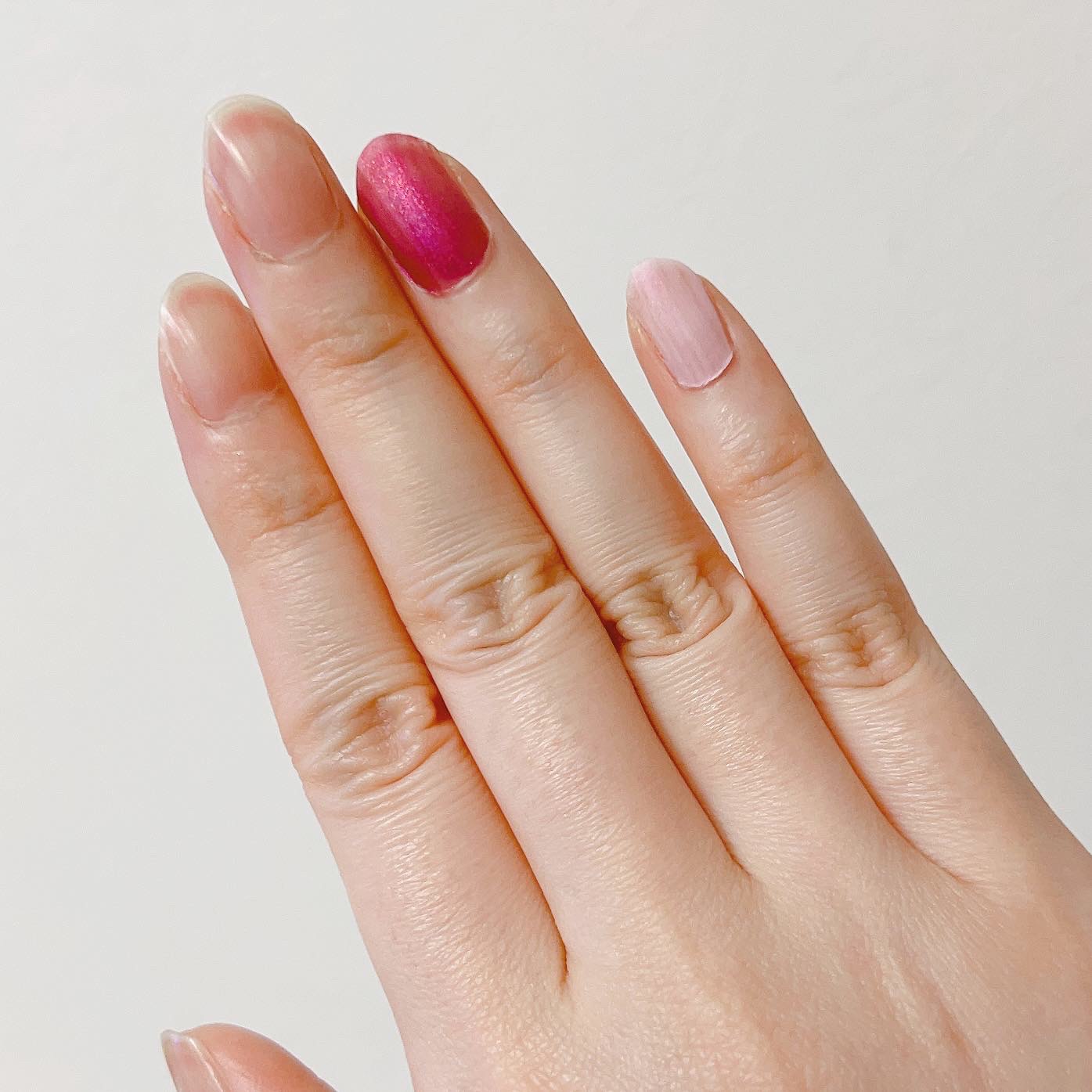 1本で3役、ベース&トップコートの成分が入った、1本でもちが良く驚きの輝きを放つ速乾性のネイルです。 そして乾くのが早くてびっくり!! ジップワインにグレープシフターを重ねてみたら、パーティーにぴったりのキラキラネイルに✨ 発色がいいところもお気に入りです🩷