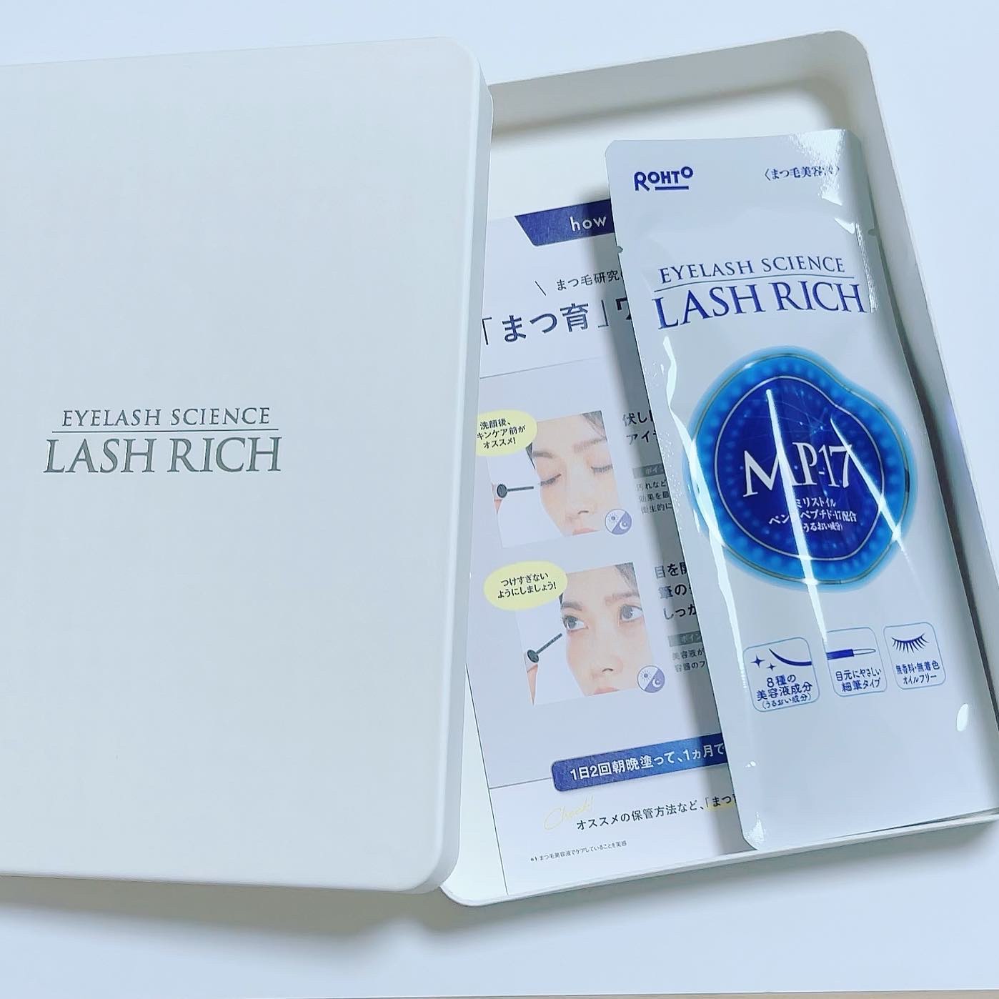 なめらかな使用感の細筆になっていて、まつ毛に塗りやすいです。みずみずしいテクスチャーの美容液で、すっと塗ることが出来ます。 ”ロート製薬が本気で作ったまつ毛美容液” 目の周りや毛髪、皮膚に至るまで多角的に研究を行ってきたロート製薬だからこそ出来た「MP-17(ミリストイルペンタペプチド-17)」配合の国内唯一のまつ毛美容液。