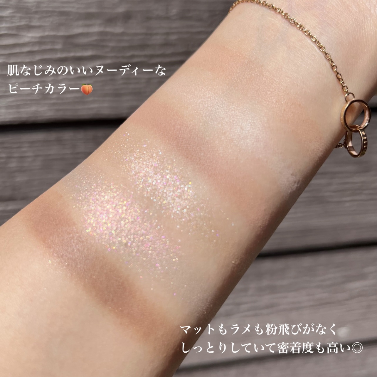 よくパレットのなかで明るいカラーをベースにまぶたに広く塗ることが多いのですが、パール感のあるカラーを避ける🙆♀️! パール感たっぷりの明るいカラーは涙袋に使うぐらい光を集めてぷっくり見せてくれるので、まぶたに広く使うと腫れぼったく見えがち😓 目元を明るくみせてくれたり、次に使うアイシャドウをぼかしやすくしてくれるけど、すっ飛ばしてメインのカラーを塗っちゃう✊🏻❤️🔥 涙袋にはたっぷり塗ってぷっくり見せる🙆♀️💕 シルキースフレアイズのマットタイプはすごく優れているな〜と感じました☺️💗 赤やオレンジなどは、入れすぎると腫れぼったく見えやすいので、見せたいカラーは下まぶた目尻にのせて色をたのしむ♡♡ パール感なしの透けマットだけじゃ物足りない… そう感じさせない華やかなラメが左上に入っているので黒目上と涙袋にのせるとすごく可愛い仕上がりに😍! 厄介な左右差のお陰でマットアイシャドウが好きになりました😌💕