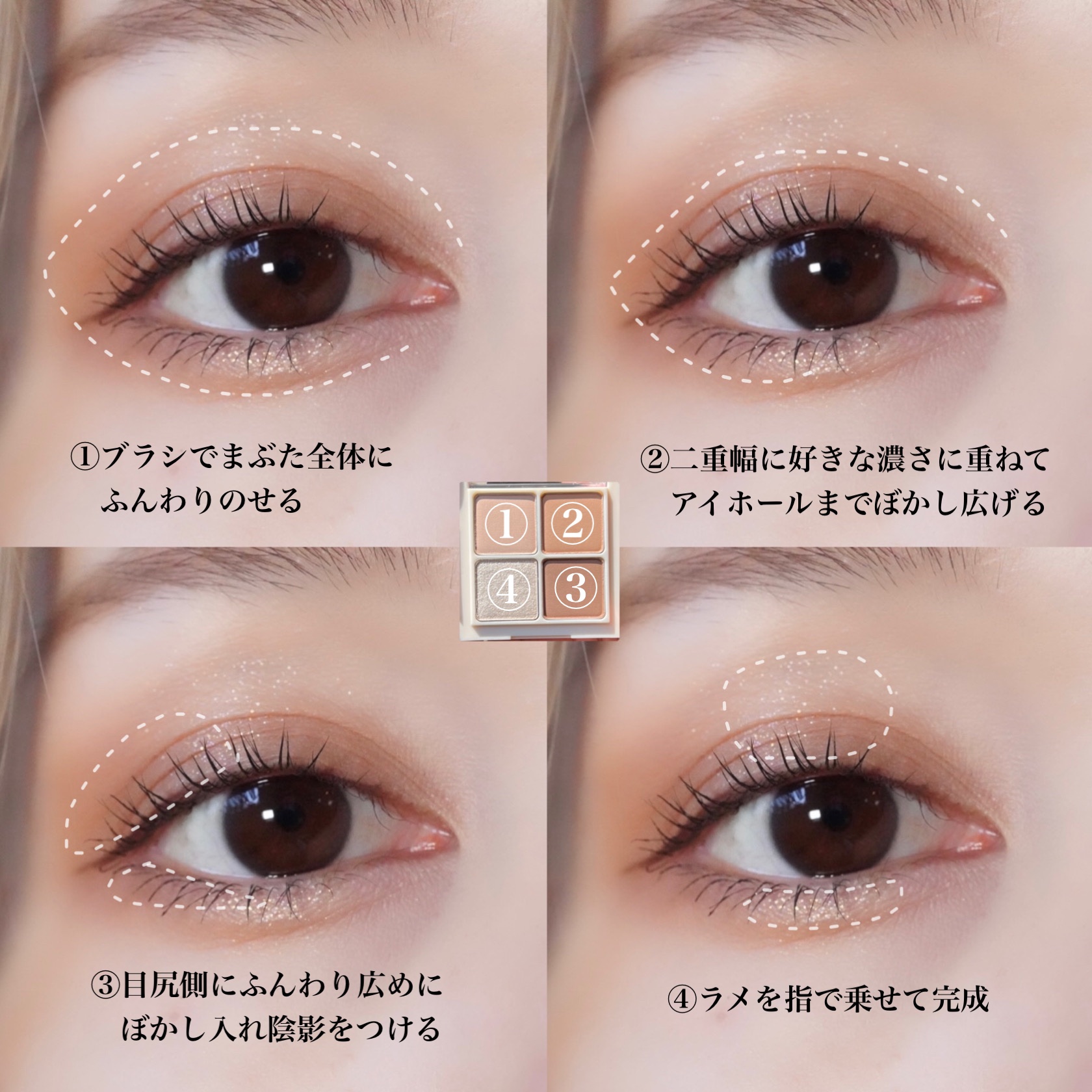 よくパレットのなかで明るいカラーをベースにまぶたに広く塗ることが多いのですが、パール感のあるカラーを避ける🙆♀️! パール感たっぷりの明るいカラーは涙袋に使うぐらい光を集めてぷっくり見せてくれるので、まぶたに広く使うと腫れぼったく見えがち😓 目元を明るくみせてくれたり、次に使うアイシャドウをぼかしやすくしてくれるけど、すっ飛ばしてメインのカラーを塗っちゃう✊🏻❤️🔥 涙袋にはたっぷり塗ってぷっくり見せる🙆♀️💕 シルキースフレアイズのマットタイプはすごく優れているな〜と感じました☺️💗 赤やオレンジなどは、入れすぎると腫れぼったく見えやすいので、見せたいカラーは下まぶた目尻にのせて色をたのしむ♡♡ パール感なしの透けマットだけじゃ物足りない… そう感じさせない華やかなラメが左上に入っているので黒目上と涙袋にのせるとすごく可愛い仕上がりに😍! 厄介な左右差のお陰でマットアイシャドウが好きになりました😌💕