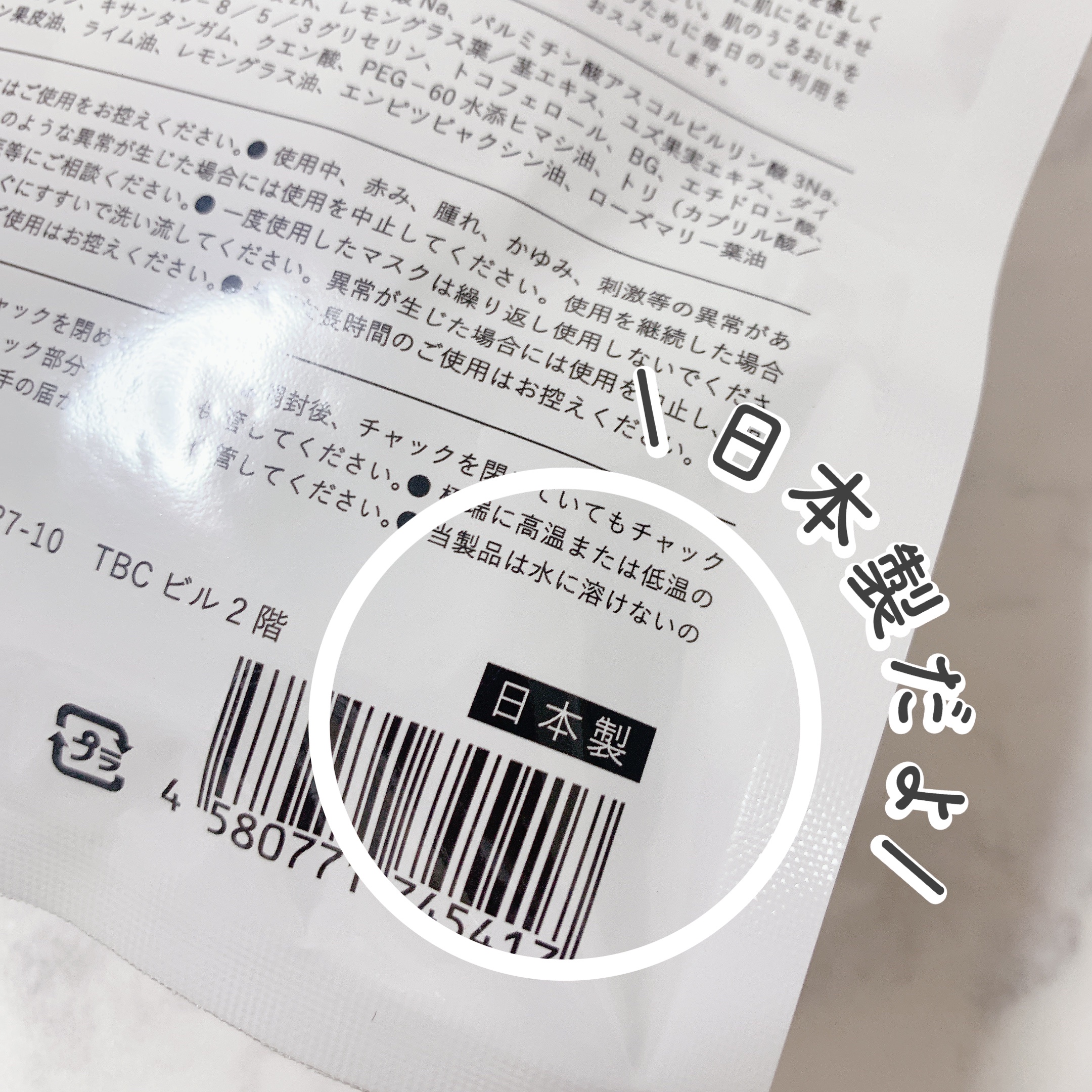 - <30枚> 水、DPG、グリセリン、水添レチノール、アスコルビルグルコシド、アスコルビルリン酸Na、パルミチン酸、アスコルビルリン酸3Na、テトラヘキシルデカン酸アスコルビル、ヒアルロン酸Na、グリチルリチン酸2K、レモングラス葉/茎エキス、ユズ果実エキス、ダイズ種子エキス、ワセリン、PEG/PPG/ポリブチレングリコール-8/5/3グリセリン、トコフェロール、BG、エチドロン酸、トリプロピレングリコール、エチルヘキシルグリセリン、キサンタンガム、クエン酸、PEG-60水添ヒマシ油、トリ(カプリル酸/カプリン酸)グリセリル、ラベンダー油、レモン果皮油、ライム油、レモングラス油、エンピツビャクシン油、ローズマリー葉油 <7枚> 水、DPG、グリセリン、水添レチノール、アスコルビルグルコシド、アスコルビルリン酸Na、パルミチン酸、アスコルビルリン酸3Na、テトラヘキシルデカン酸アスコルビル、ヒアルロン酸Na、グリチルリチン酸2K、レモングラス葉/茎エキス、ユズ果実エキス、ダイズ種子エキス、ワセリン、PEG/PPG/ポリブチレングリコール-8/5/3グリセリン、トコフェロール、BG、エチドロン酸、トリプロピレングリコール、エチルヘキシルグリセリン、キサンタンガム、クエン酸、PEG-60水添ヒマシ油、トリ(カプリル酸/カプリン酸)グリセリル、ラベンダー油、レモン果皮油、ライム油、レモングラス油、エンピツビャクシン油、ローズマリー葉油