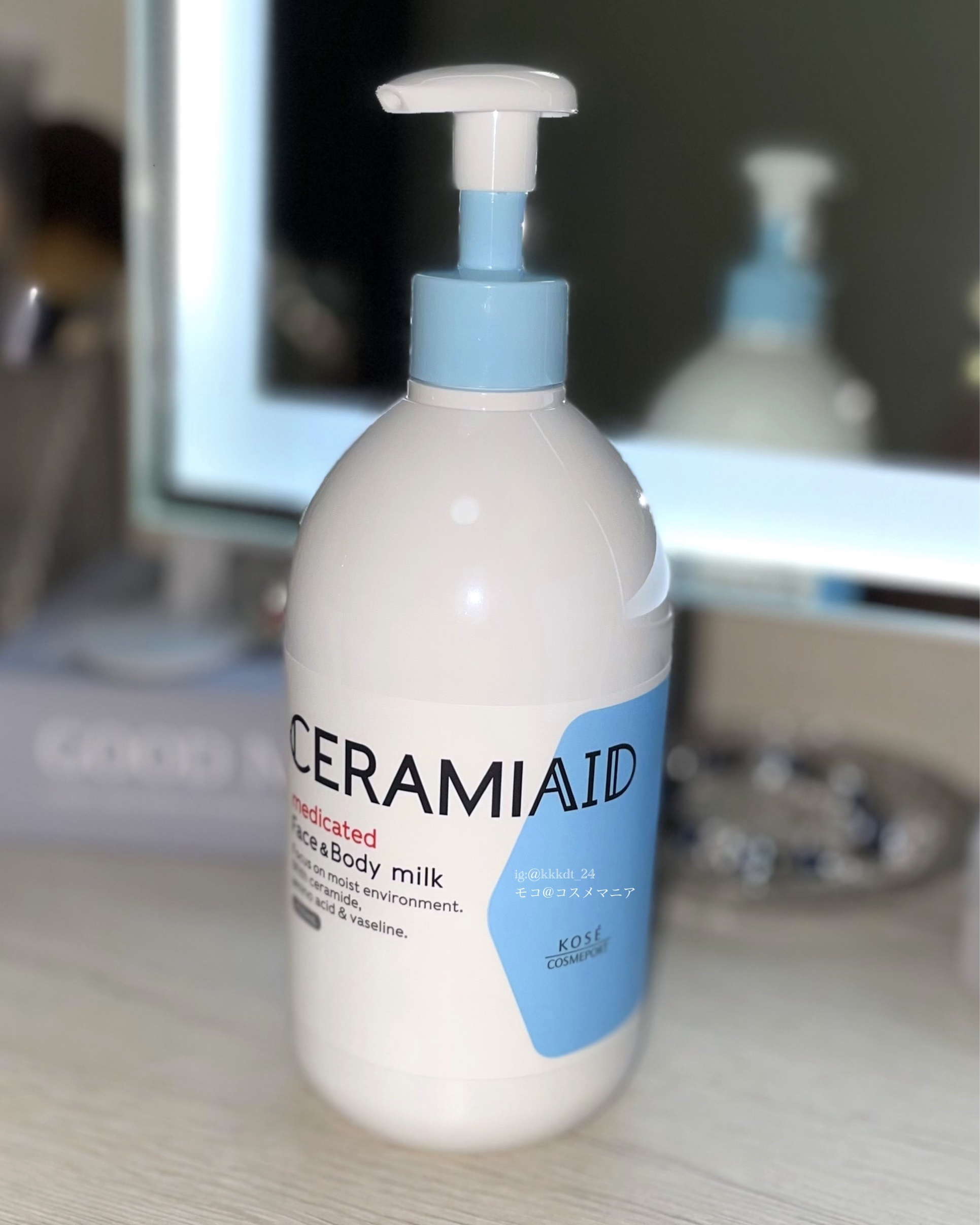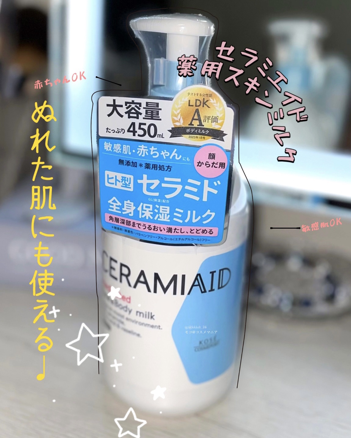 セラミドエイド 薬用スキンミルクは、人が作り出すセラミドと同じ構造をしたヒト型セラミドが肌のバリア機能を補ってくれるボディミルク♪ 無添加の医薬部外品だから赤ちゃんでも使えるくらいやさしい使用感なんだよ👶🤍 ぬれた肌にも使えるからお風呂上がりにささっと塗れちゃうところもお気に入り☺️