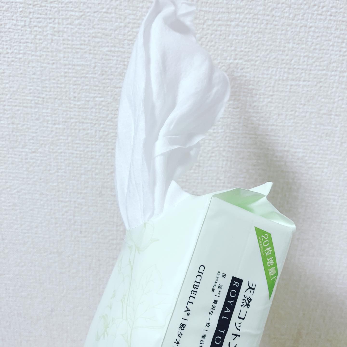 CICIBELLAロイヤルタオルを使ってみていいなぁと思ったのは20センチ✖️20センチと顔を覆える大きさ✨厚みもしっかりとあり、吸収力もgood✨使い捨てだから衛生的✨ 化粧水や美容液を染み込ませてパックにするという使い方もできますよ〜☺️ 置き型としても使えるし、フックなどに引っ掛けて下からも引っ張り出せるようになってます✨