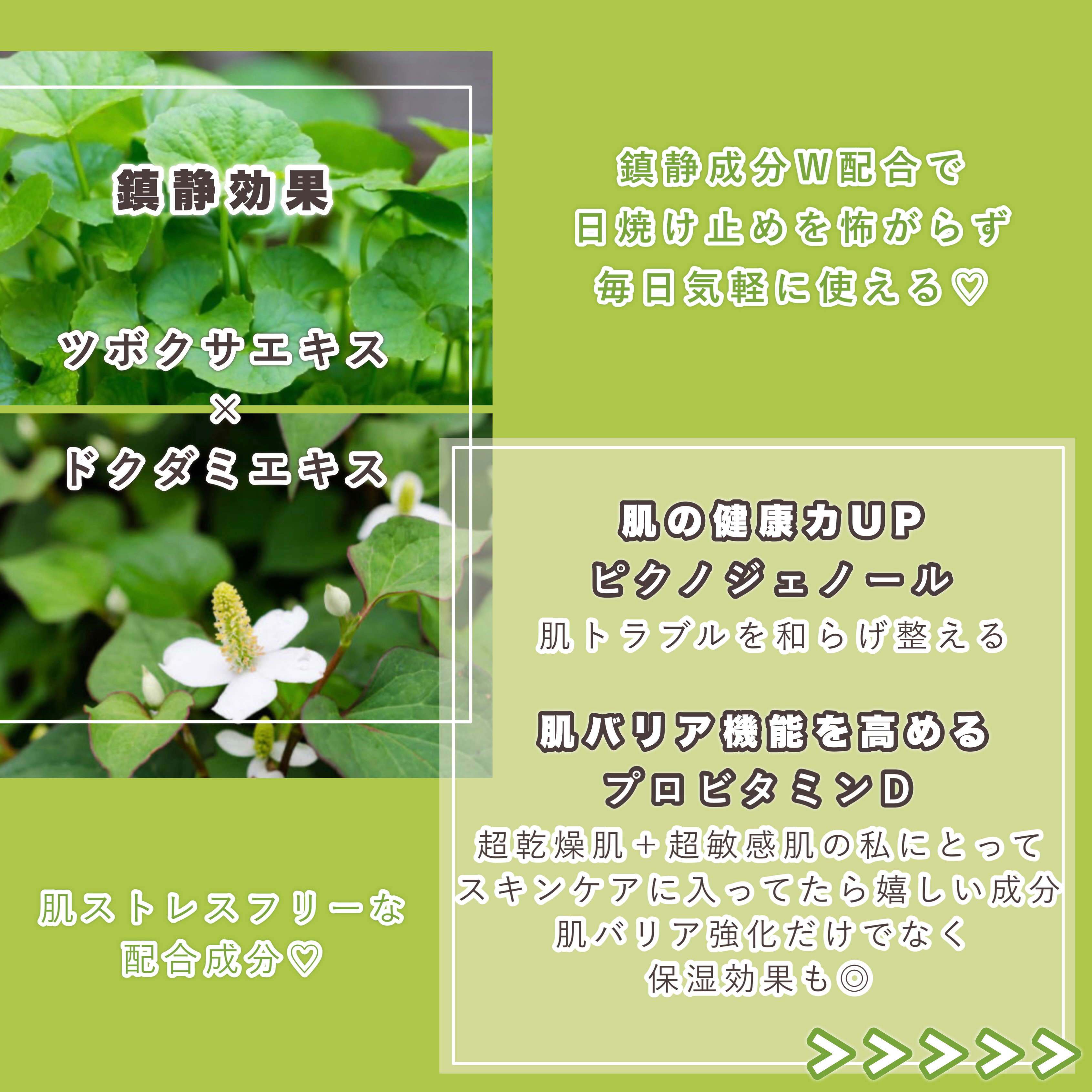 - 肌への負担感の少ない使い心地でしっかり紫外線をカットする日焼け止めです。無機系(紫外線散乱剤)の日焼け止めなので、肌で光を跳ね返し、紫外線が肌に吸収されないようにします。 塗った瞬間から紫外線を反射し、白浮きしにくくモロモロも出にくいので化粧の邪魔にもなりません。 保湿成分もたくさん配合しており、ツボクサ*やドクダミ*は、肌を整え肌荒れを防ぎ、敏感な肌を乾燥などの外部の刺激から守ります。ピクノジェノール*は紫外線による刺激から肌を守り、プロビタミンD*は肌のバリア機能をサポートします。 *整肌成分