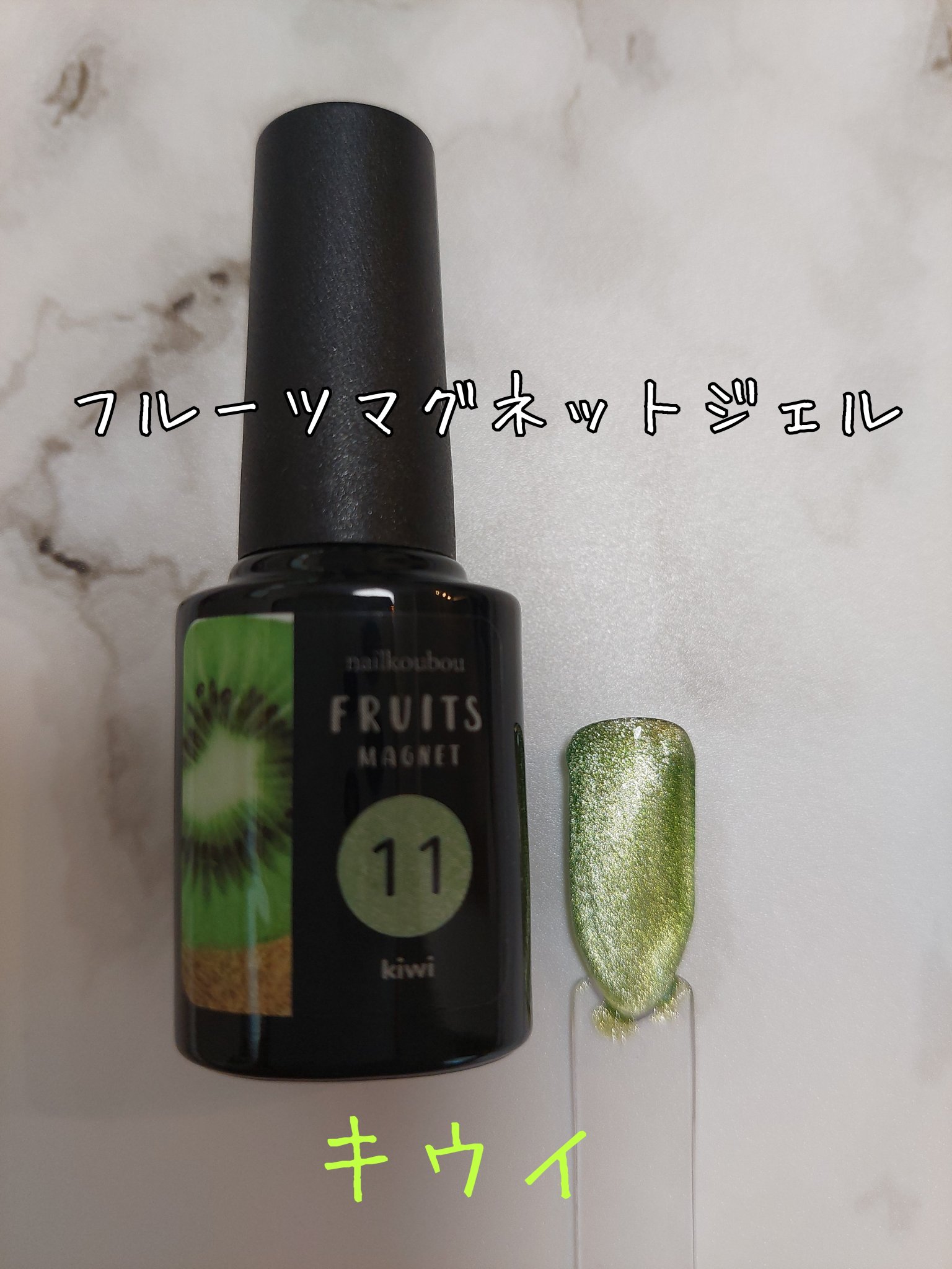 ネイル工房 フルーツマグネットジェル11 キウイ 明るい緑色!❤ 🥝キウイみたい! 緑とかってなかなか使わないと思うんだけどフットとかに使っても可愛いと思うし、私は好きです(*´ω`*) 動画でも光り方見てください😊 たまごでした