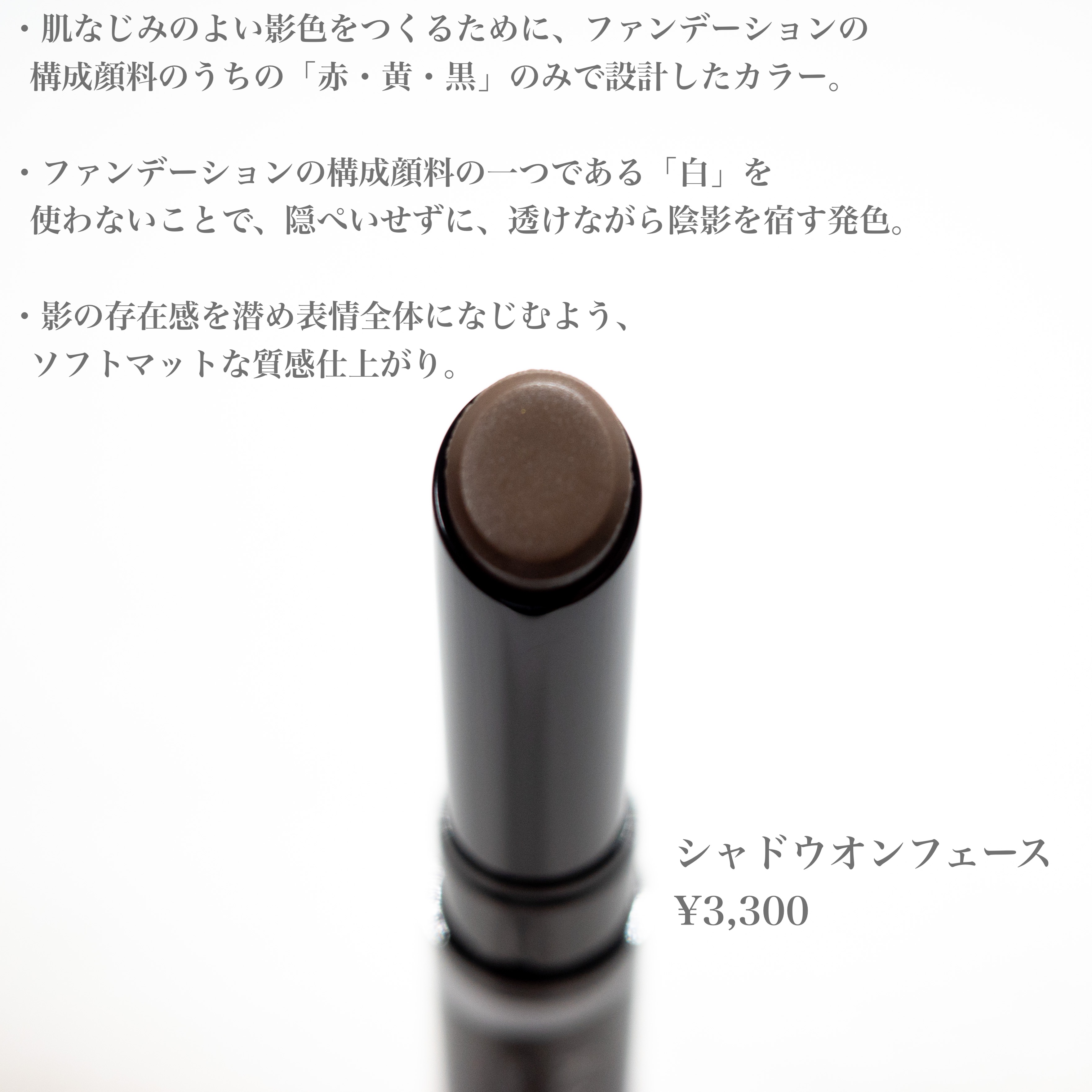 - 「透け影」を塗る。肌に溶け込むような陰影を仕込む。 リアルな影色と絶妙な透け質感で、顔の造形を自然に際立たせるフェースカラー。 ※7月11日9時半より予約開始