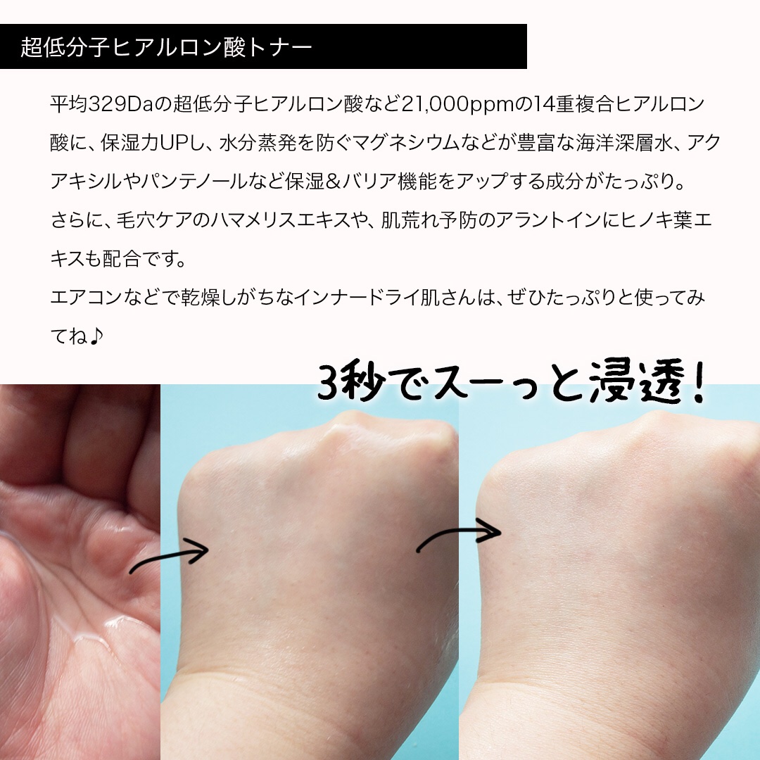超低分子ヒアルロン酸ライン🩵 ✔️全成分マイルド植物抽出&全成分EWG安全等級 ✔️14重複合超低分子ヒアルロン酸と鬱陵島(韓国の地域の一つ)海洋深層水の清涼感で肌の渇きを解消 シャバシャバでさらっとしたテクスチャーのトナー♡ 軽い使用感で、ベタベタしないから重ね付けやコットンパックがしやすかったよ✨ ヒアルロン酸系のアイテムってベタつくイメージだったけどこのラインはベタつきなく保湿はしっかりしてくれるから乾燥ケアにおすすめ🫶🏻