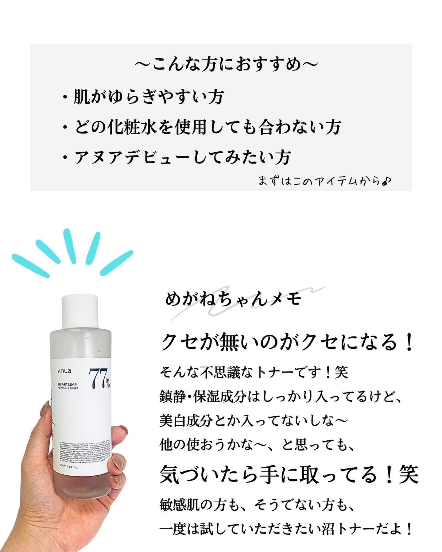肌にスッとなじむ「軽やかとろみテクスチャー」の化粧水! Anuaのドクダミスージングトナー💧 77%ドクダミエキス配合で敏感肌・ニキビ肌にもやさしく密着しバランスを整えてくれる🙆♀️ 洗顔後の拭き取りや吸収トナーとしてはもちろん、コットンパックでスージングケアも◎