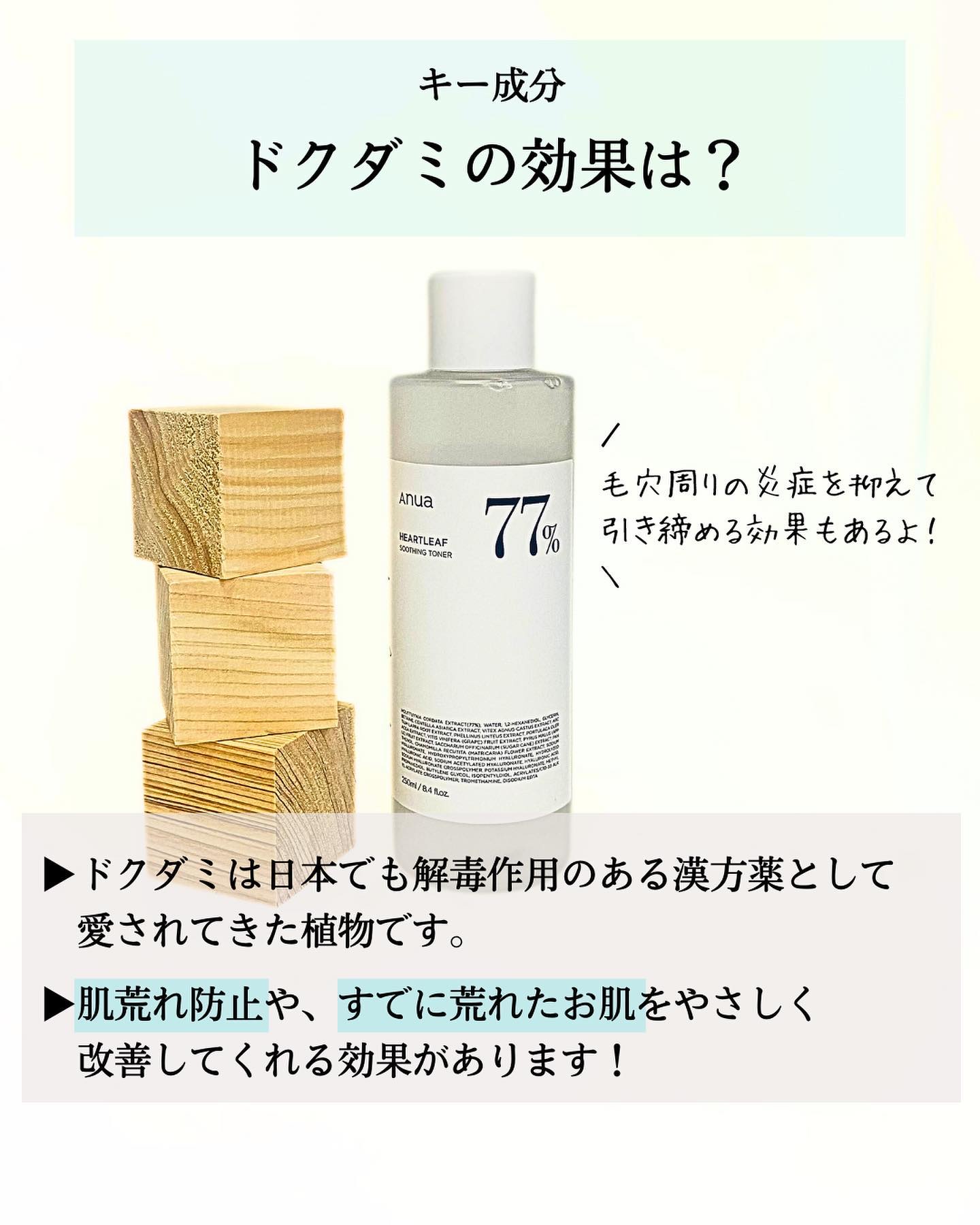 - 天然由来成分のドクダミソウエキスを77%配合し、疲れたお肌やトラブルケアにおすすめです。 「ドクダミ80%スージングアンプル」とセットでご利用いただけます。 ①低刺激テスト完了 敏感なお肌にも安心して使用可能 ②ダメージを受けたお肌を鎮静 ドクダミソウ77%配合で皮膚の鎮静力強化 ③PH5.5弱酸性トナー お肌の内側の崩れた油水分のバランスを調節 ④ニキビ肌に最適 ノンコメドジェニック認証トナー ●低刺激テスト済み ●ノンコメドジェニックテスト済み ●肌鎮静効能臨床テスト結果 トラブル肌試験部位の赤みは11.4%減少、経皮水分損失量は12.97%減少し、肌の鎮静効能が認証されました。