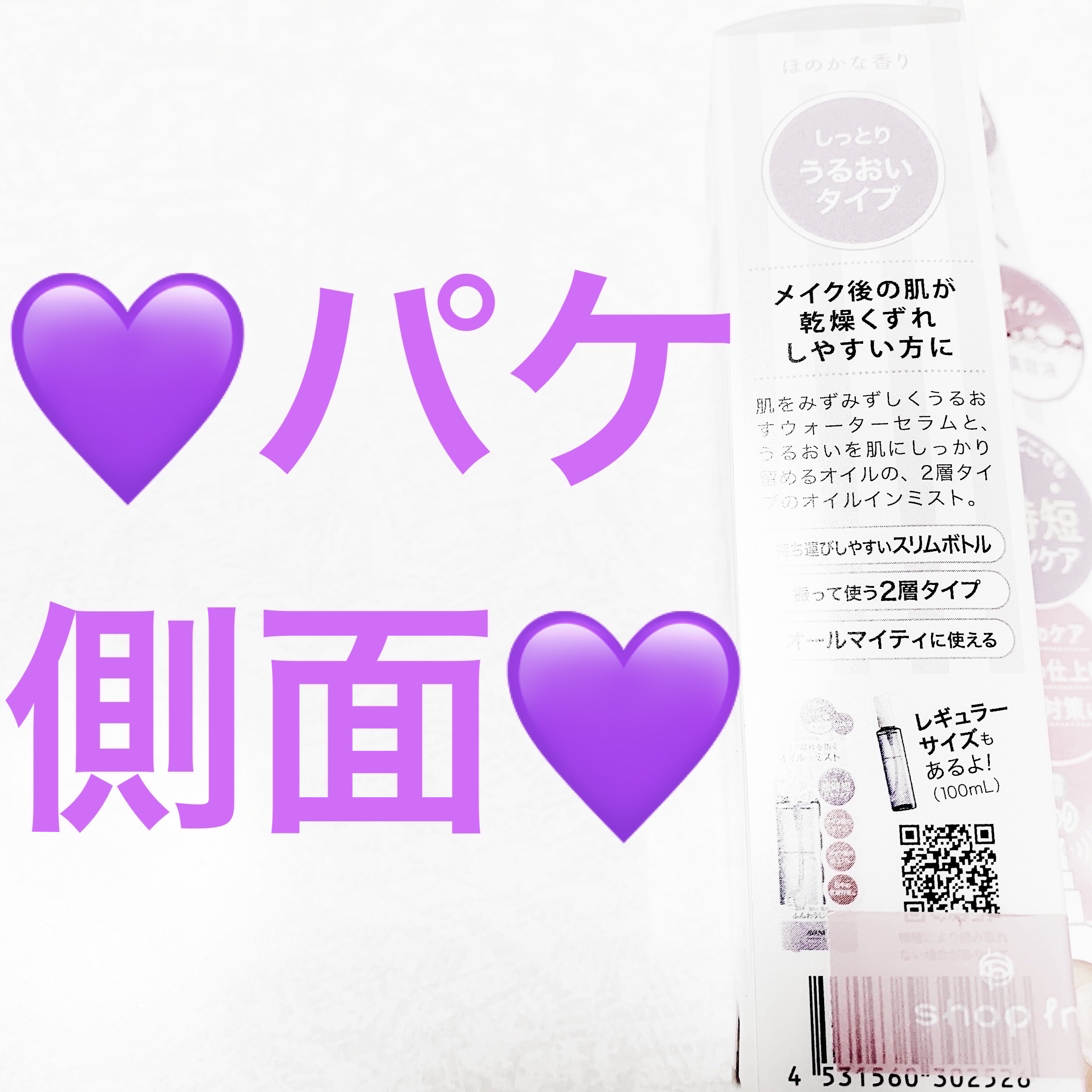 - シャカシャカ振って3プッシュ! いつでもどこでも超時短スキンケア! ●メイク崩れを防ぐオイルインミストです。 ●メイクのノリ & モチが劇的にUP!! ●うるおいロングキープ! 乾燥による過剰な皮脂の分泌を抑えます。 ●細かい霧のふんわりミストタイプ。