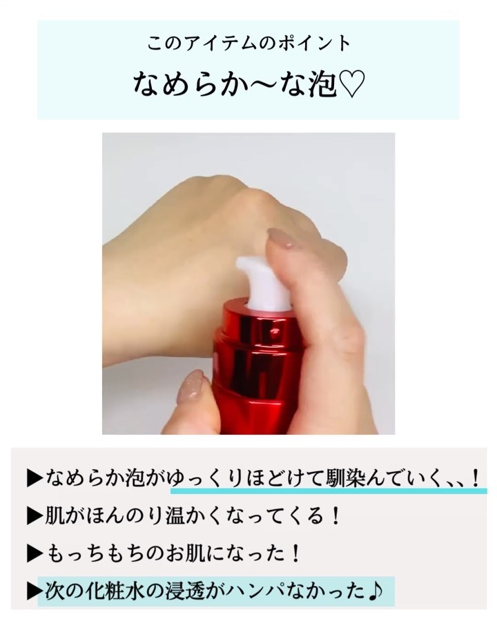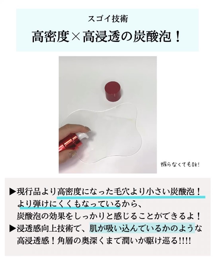 - 肌に触れた瞬間、とろけるようになじむ、濃厚でなめらかなマイクロ炭酸*1 泡の美容液。 お手入れのファーストステップとして使用します。 ●美白有効成分カモミラET配合 メラニンの生成を抑え、シミ・ソバカスを防ぐ ●ブランケア成分*3 配合 *1 炭酸ガス(噴射剤) *3 保湿:アルテアエキス、ユーカリエキス、ユズエキス