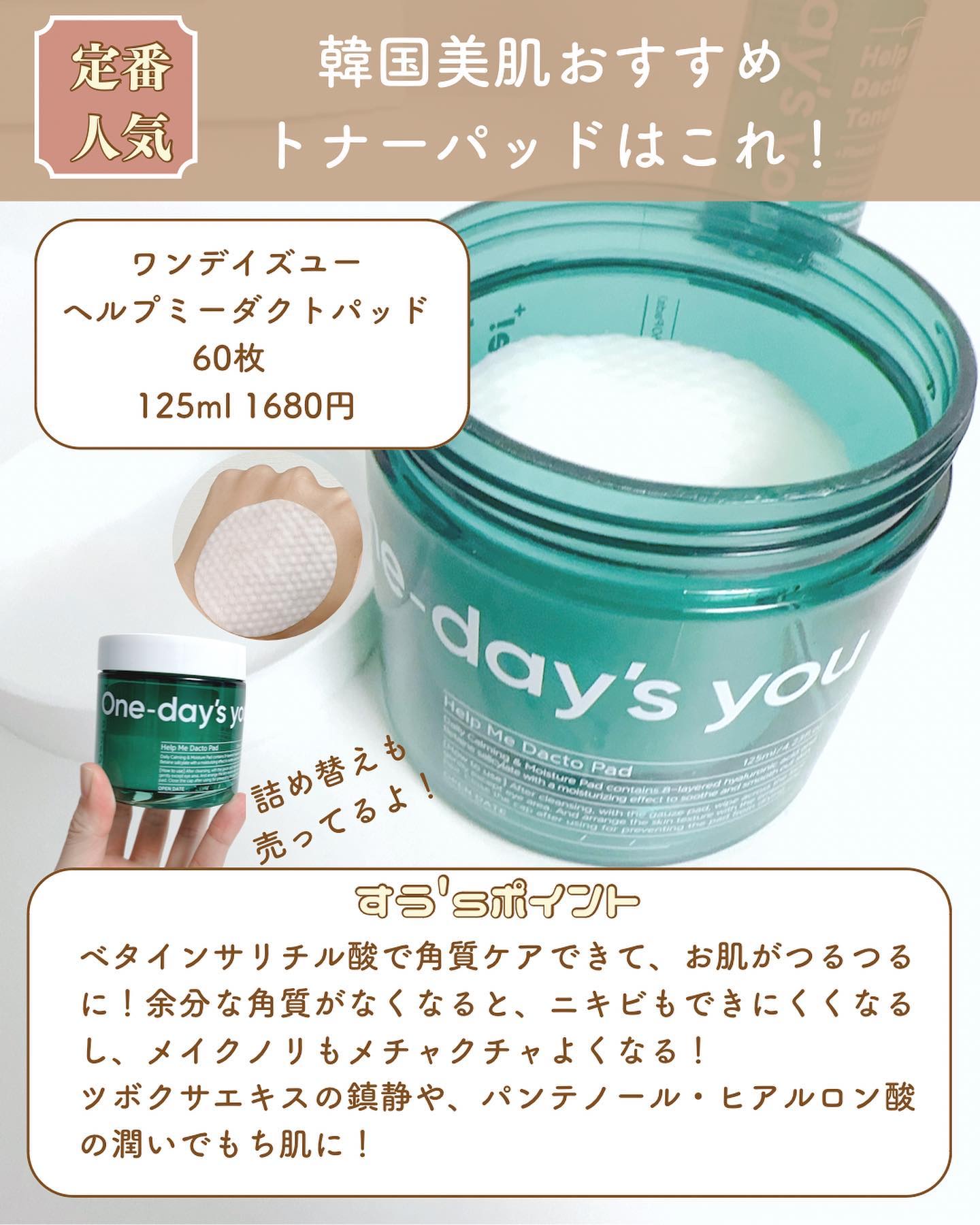 今まで使った中で1番好き!!!使い切り!!One-day'syouヘルプミー!ダクトパッド120ml60枚¥330〜昔からバズってるイメージの商品!!!特徴としては敏感肌さんも使える角質ケアと鎮静のあるトナーパッド私は基本的に朝の拭き取り化粧...