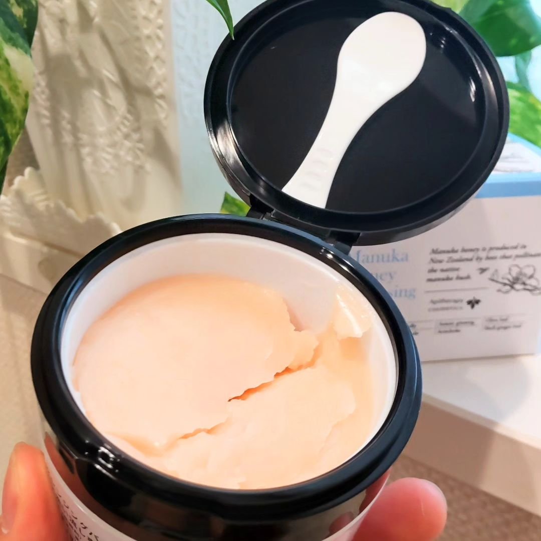 マヌカハニークレンジングバーム🍯.付属のスパチュラでバームを肌にのせて、肌温にとろりととろけるバームは、メイクの上でくるくるするとスルスルメイクと馴染む❤︎.マヌカハニーのおかげか、私は洗い上がりのしっとり感が感じられて満足🫶.抗菌成分を含む...