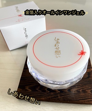- オールインワンジェル『しあわせ想い』は、幸せのシンボルである四つ葉のクローバーから作られた成分*や、金沢産の高級金箔を配合。時短・美・幸運と、高品質スキンケア化粧品でありながら【縁起物】としての要素をプラスした、すっぴん笑顔が輝くスキンケア化粧品です。また3D形状記憶ジェル**によりお肌にハリを与え、高い弾力性を発揮。さらに独自処方成分により角質層への保湿成分の浸透力をサポートします。 *シロツメクサエキス(保湿成分) **形状を変化させても元の状態に戻るジェル