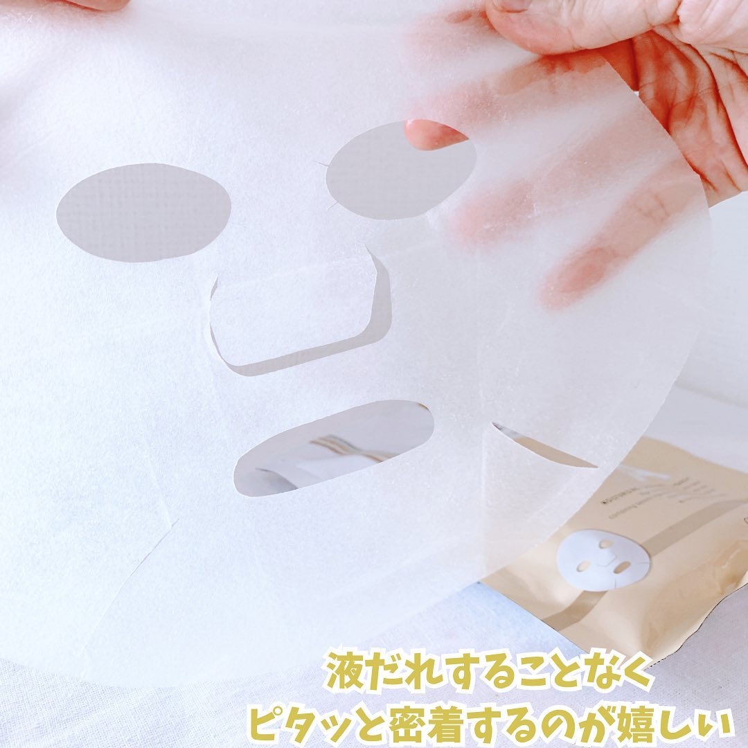 VC100 × レチノール を配合。マスク着用による乾燥や、毛穴悩みに集中アプローチし、ハリ、ツヤ、透明感を与えてくれるそう✨ 袋の中にもシートにも美容液がヒタヒタです。顔全体にフィットさせて5〜10分。パック中に液垂れはありません。 無添加なので肌に優しく、敏感肌の方にも使いやすいと思います。